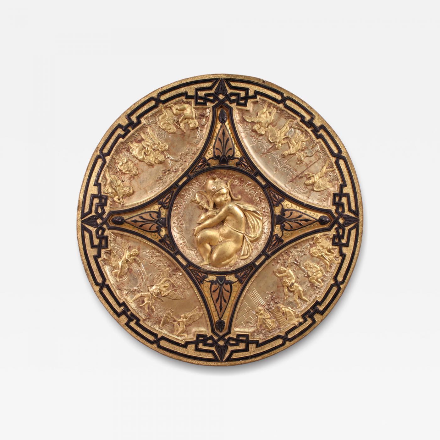 Large 19th-century decorative shield. Finely carved and gilded wood work with mythological motifs and figures, signed F. Barbedienne Paris, attributed to the great French foundryman Ferdinand Barbedienne (1810-1892). Founded in 1834, Maison Barbedienne became the most famous bronze company in the country, reproducing works by great artists and creating its own original objets d'art that achieved international success.