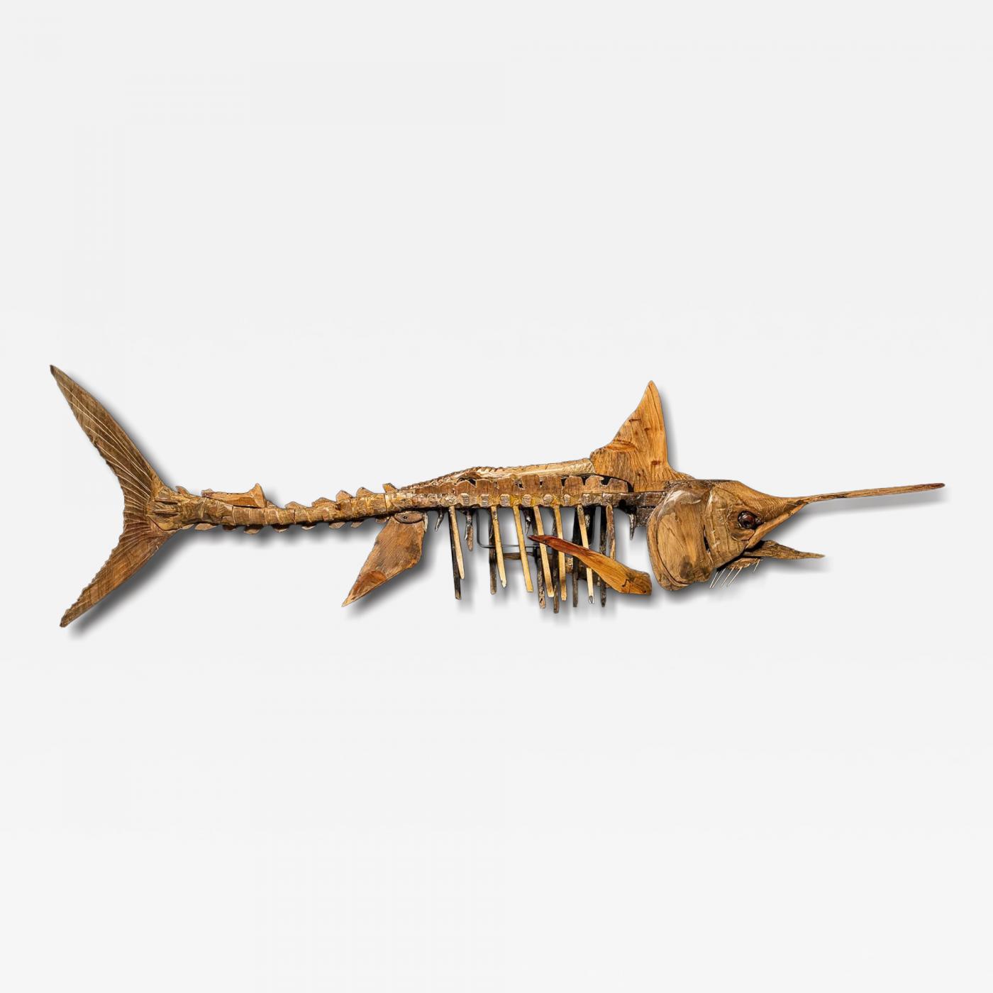 A large handmade wooden sculpture, study of a Marlin, in skeletal form