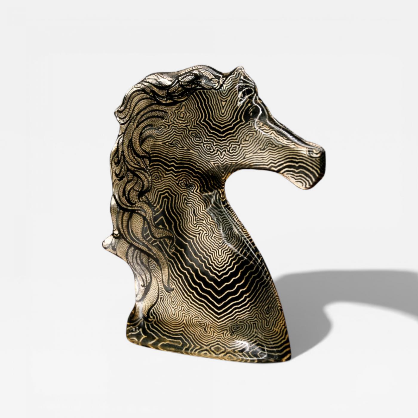 The horse’s head and neck are rendered in a continuous, flowing outline, with the mane articulated through rhythmic linear incisions that introduce depth without interrupting the planar integrity of the piece. The surface is animated by an intricate, topographic patterning that follows and disrupts the form simultaneously, creating a dynamic interplay between graphic line and sculpted edge. This layered treatment reinforces the object’s dual identity as both relief and freestanding sculpture.