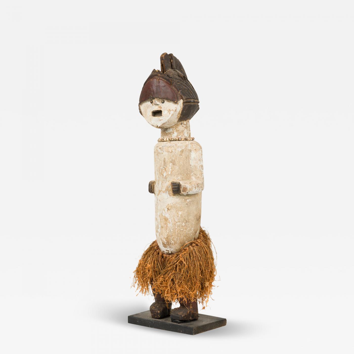 Gabonese 20th c. fetish figure hand carved and pigmented wood by the Ambete people of Gabon with a cowrie shell necklace and raffia grass skirt