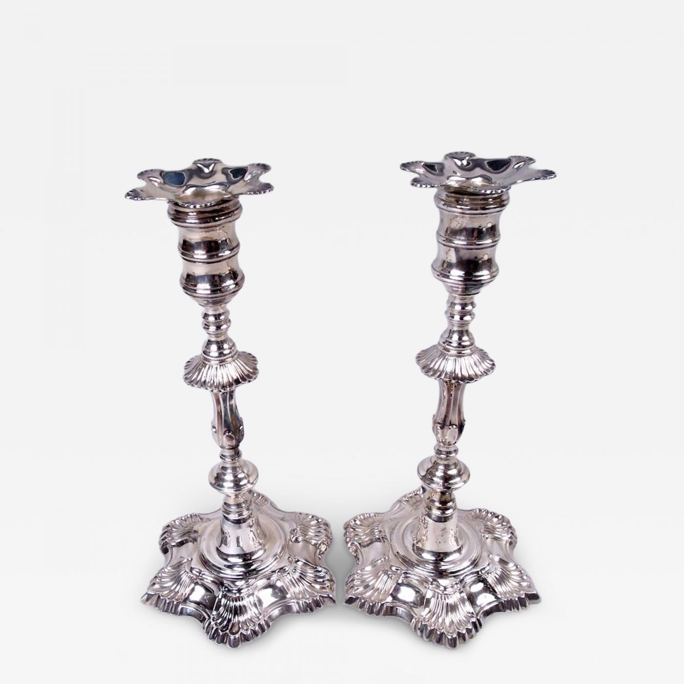 Pair of traditional American Colonial sterling silver candlesticks. Each: Spool socket on baluster shaft with knops and flange; domed foot. Six shells on socket and foot rims. Marked “Sterling” with retailer’s stamp (“Metropolitan Museum Reproduction”) and phrase “Myer-Myers-New York-About 1759”. Very good condition.