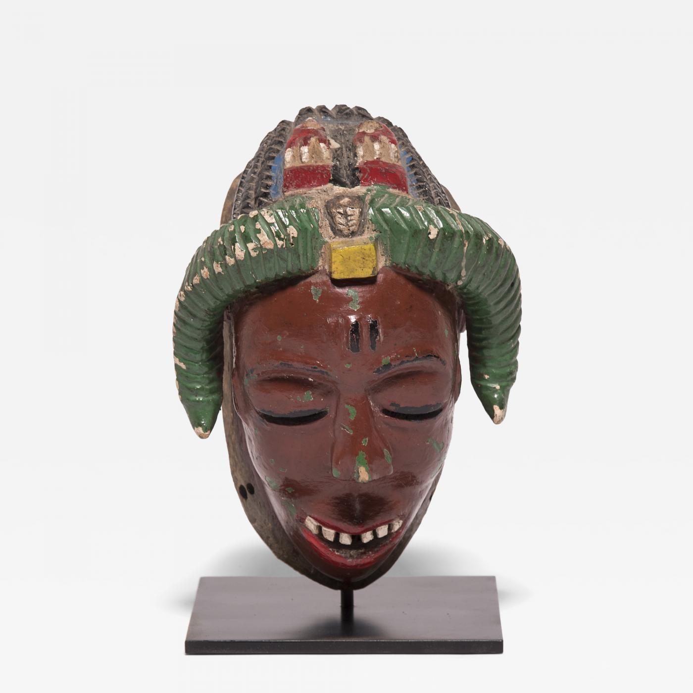 To ward off evil and exert positive influences on the spirit world, the Baule people engage in a daylong masquerade known as the Goli. A sequence of four masks are donned during the performance, with the last and most important being the kpan, or senior female. Honored with graceful, rhythmic movements, the mask expresses the dignity and majesty of a senior-ranking woman. The mask’s sculpted cheekbones, arched eyebrows, and elaborate hairstyle composed of intricate braids evoke the Baule ideal of feminine beauty. // Depth: 5.0"