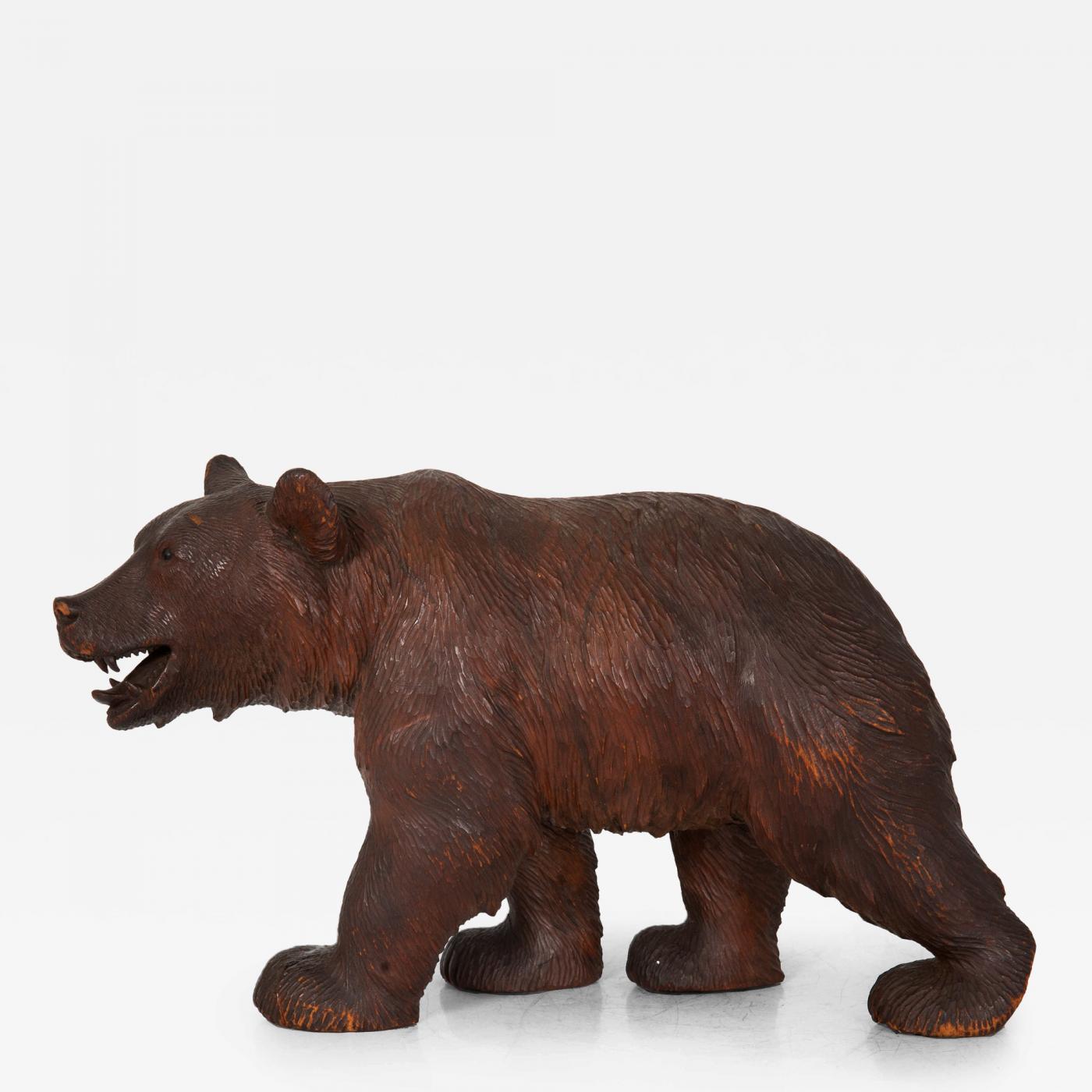 Retaining original glass black eyes 9 3/8" H x 5 1/8" D x 16 1/8" W A finely carved Black Forest bear, depicted mid-stride with mouth agape and detailed fur throughout, retaining its original glass eyes. Finished with a rich, dark stain, the figure captures the naturalistic vitality characteristic of late 19th- and early 20th-century Swiss carving. The undersides of the feet are twice marked "XIV". Condition: