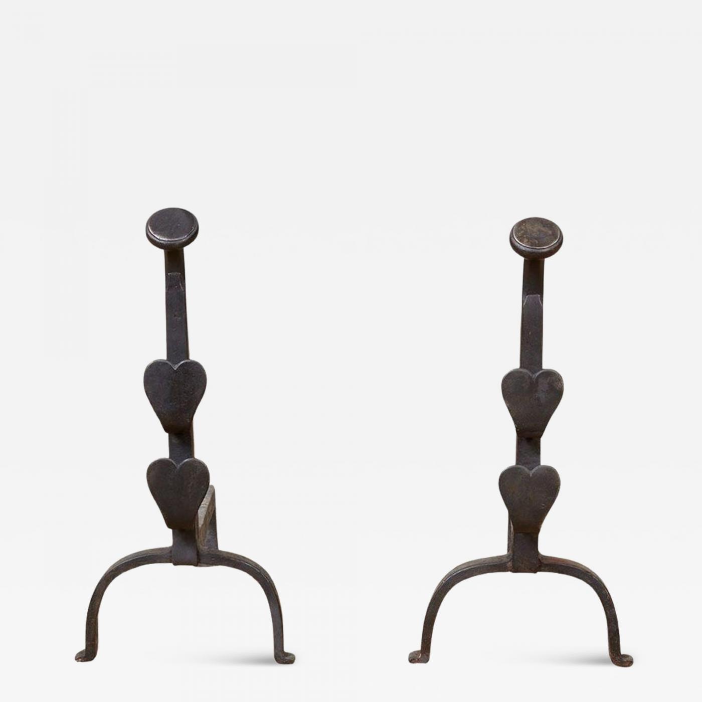 A pair of hand-forged black iron andirons with disk tops on substantial tapering square section shafts, each featuring a pair of heart-shaped spit supports over arched legs. English, circa 1800. Good scale and weight, and beautiful craftsmanship.