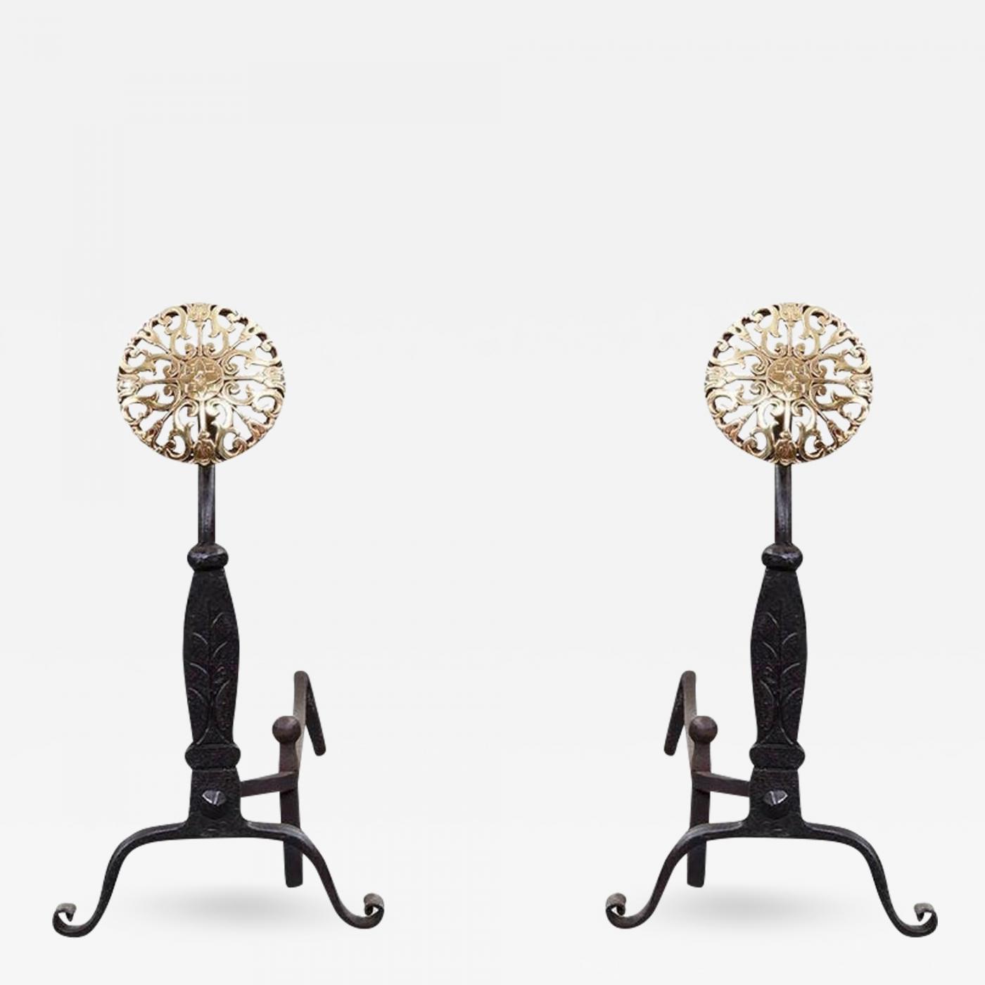 A pair of black iron andirons with sculpted and stamped shafts on arched feet ending in scrolled toes, with robustly peaned back supports, surmounted by brass rosette disks with tulip motifs applied to circular steel backplates.