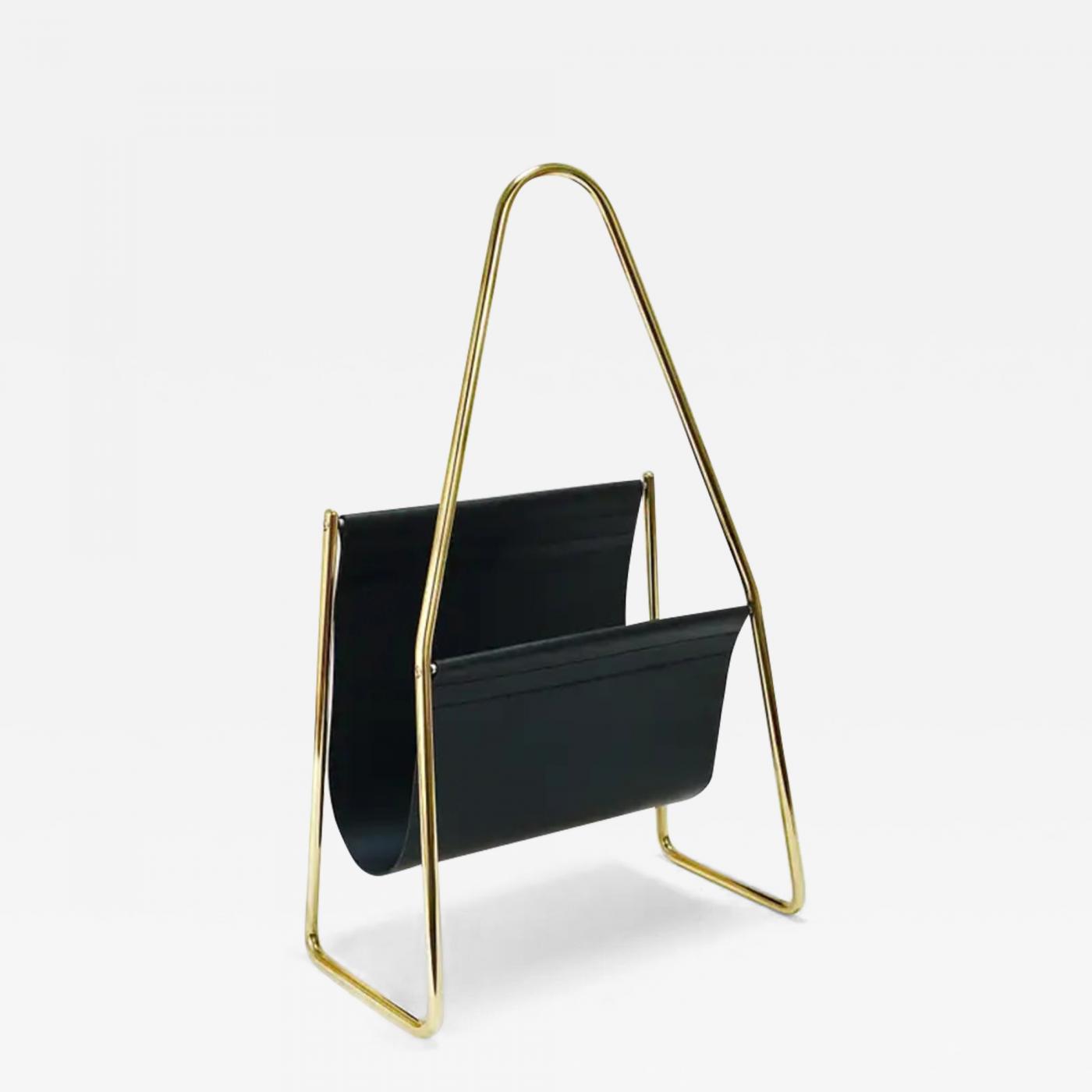 Carl Auböck II Midcentury Magazine Rack, Brass & Black Leather, Vintage, Austria