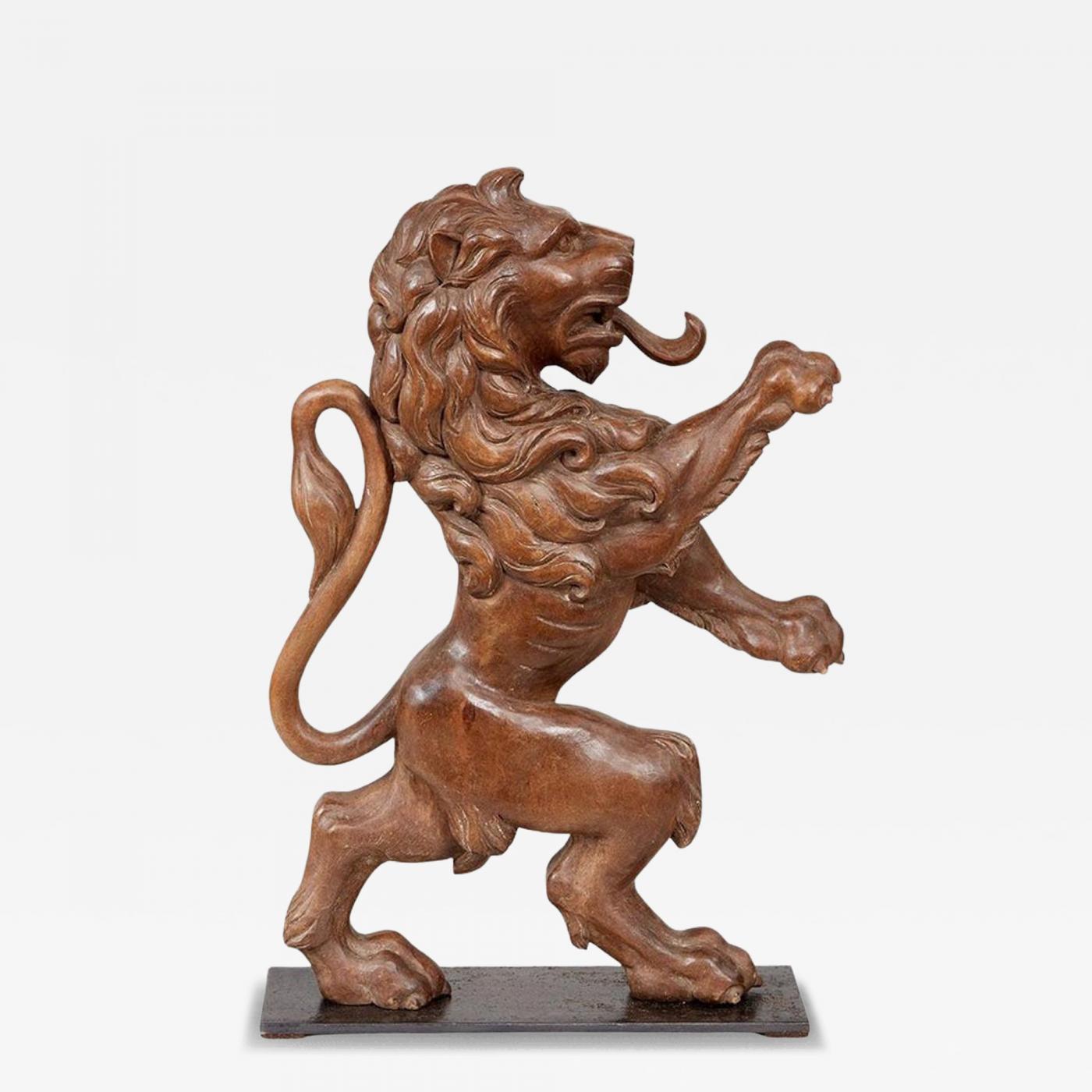 A carving of a fearsome rearing lion, the position known as rampant, in silvery limewood. Fully carved to front and back. Depictions of lions rampant can be found on heraldic coats of arms, and this one is notable for having his tongue out, a sign of strength. Now on custom metal stand. Can also be wall hung. English, 19th century.