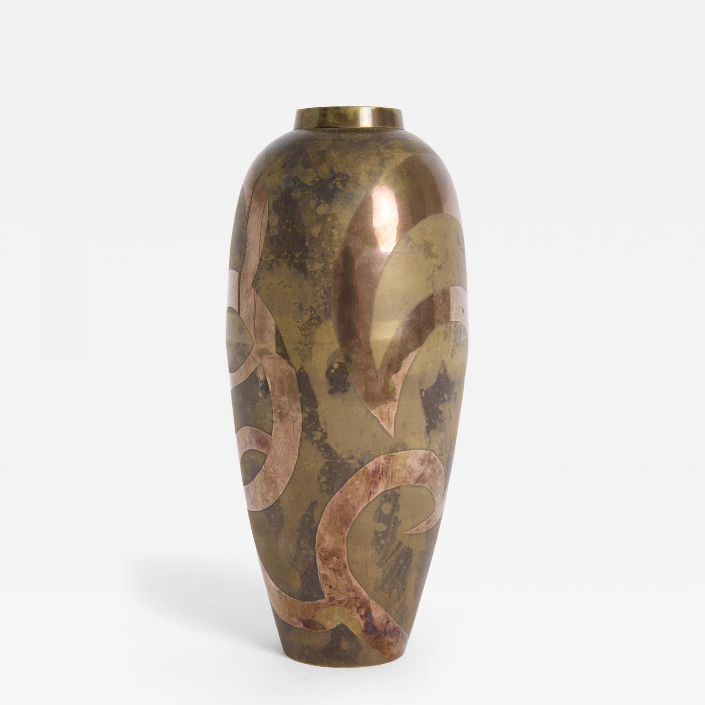 An Art Deco copper and brass dinanderie vase, intricate pattern and excellent patination throughout.