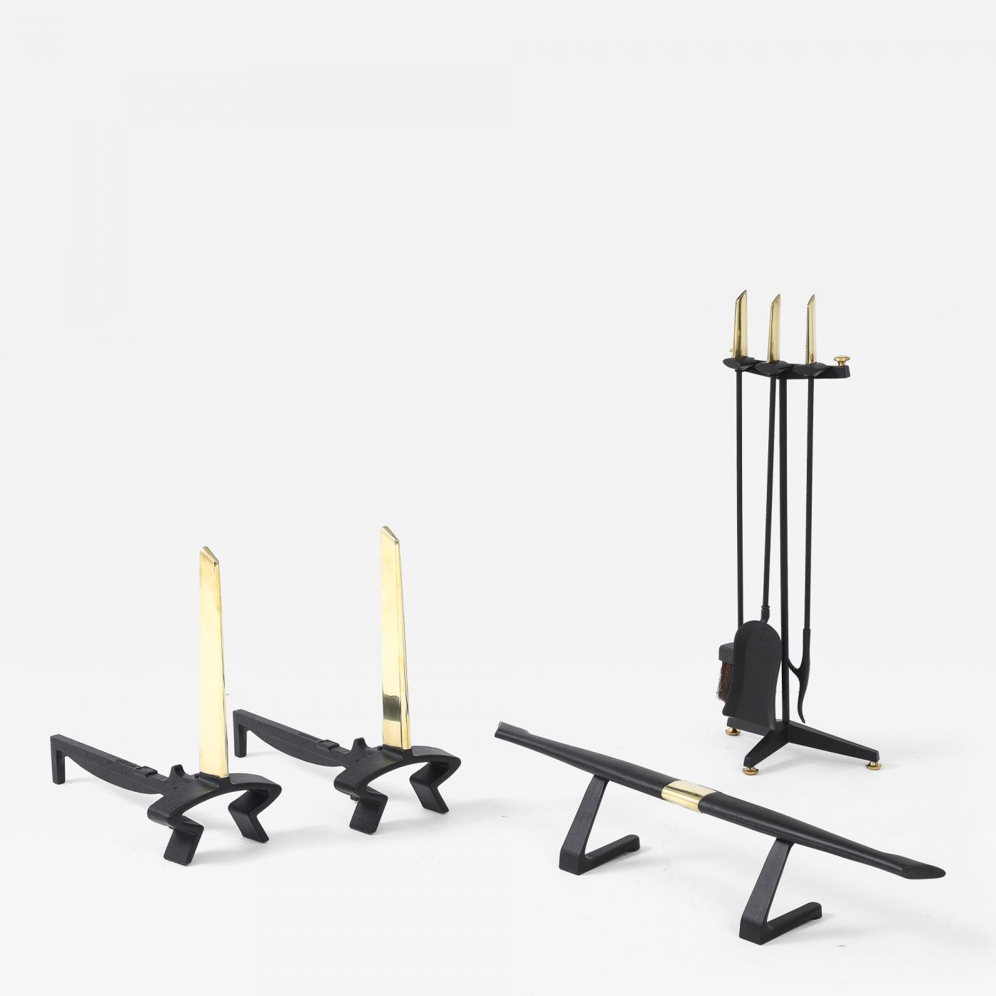 Amazing set of 1960's mid-century modern brass and iron fireplace set designed by Donald Deskey for Bennet, the set includes fireplace tools, andirons and fire guard in vintage condition with some wear and patina due to age and use, lightly restored and the brass has been gently hand polished.