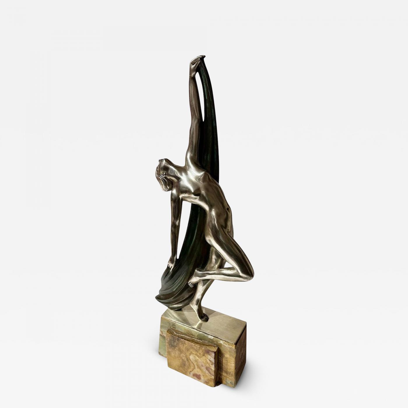 An Art Deco bronze sculpture ” Draped Woman” by French artist Emile Phillippe created especially for Ovington Brothers of New York in the late 1920s. A stunning female figure gracefully extends her arm to the heavens, holding aloft draped fabric. The piece is rendered in nickel silvered bronze along with cold painted detail of verdigris color on the draping. She stands on a unique three dimensional marble base topped with a nickel plate. It has an exceptional vertical design and stands 25″ tall with all the classic nuance of Art Deco glamour, showing a fascination with the female form.