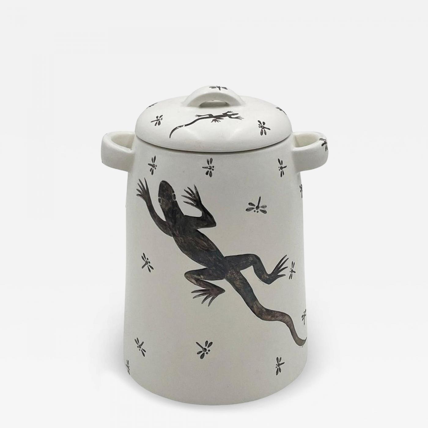 A large lidded container designed and handcrafted by renowned Mexican artist Emilia Castillo in Taxco, Mexico. This striking piece is made of white porcelain inlaid with pure silver, featuring whimsical lizards and dragonflies that climb and dance across the surface. Castillo’s signature integration of natural themes with refined craftsmanship makes this vessel a standout example of her celebrated design language.