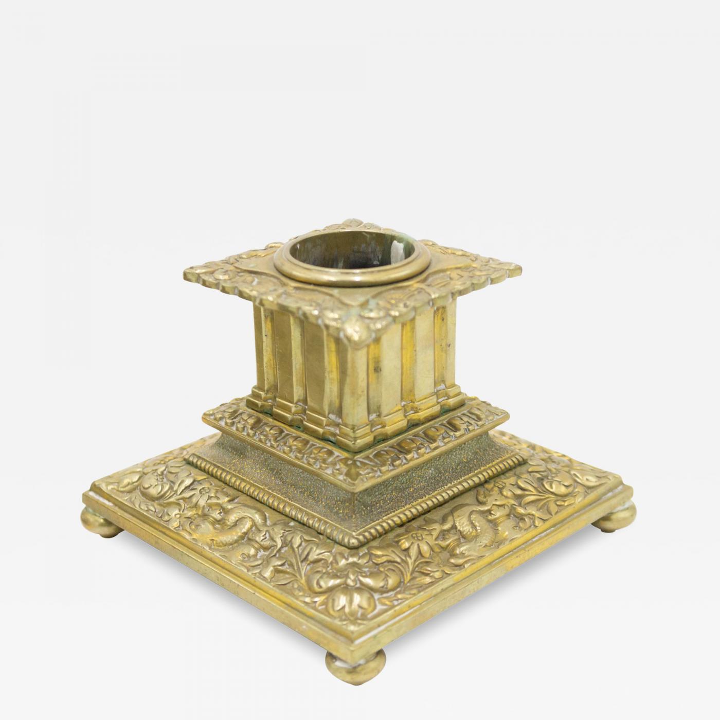 English Chinese Chippendale-style (19th Century) brass square candlestick with dolphin and floral design and fluted shaft resting on ball feet