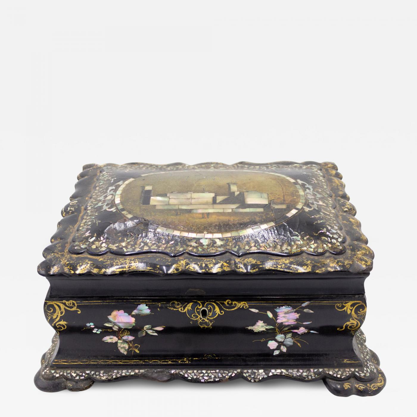 English Victorian papier mache pearl inlaid rectangular shaped box with oval shaped center.