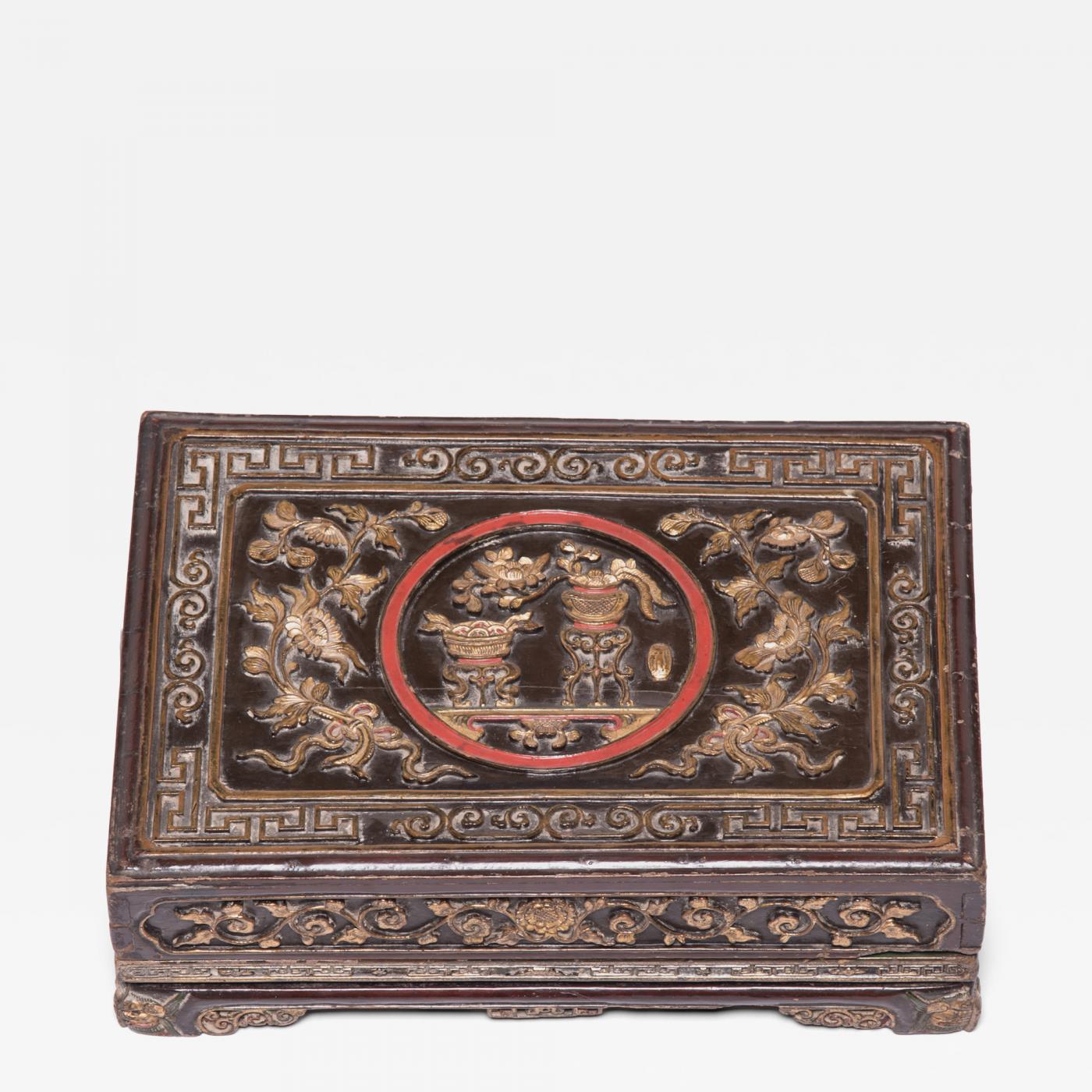Depth: 10.0" | This ornately carved 19th-century offering box would have been presented as a gift filled with popular Chinese snacks, including roasted melon seeds, dried fruit, and soybeans toasted with cinnamon, fennel, and other spices. Offering fruits, floral filigrees, and geometric borders cover the wooden box, highlighted by a red-lacquered medallion circumscribing a lavish still life. Likely offered as a wedding gift, the box interior is adorned with a trailing floral motif formed as gilt abstract butterfly, a traditional symbol of lasting love. It is a standout for boxes of its kind—in twenty years, it is one of the most intricate and elaborate we have found.