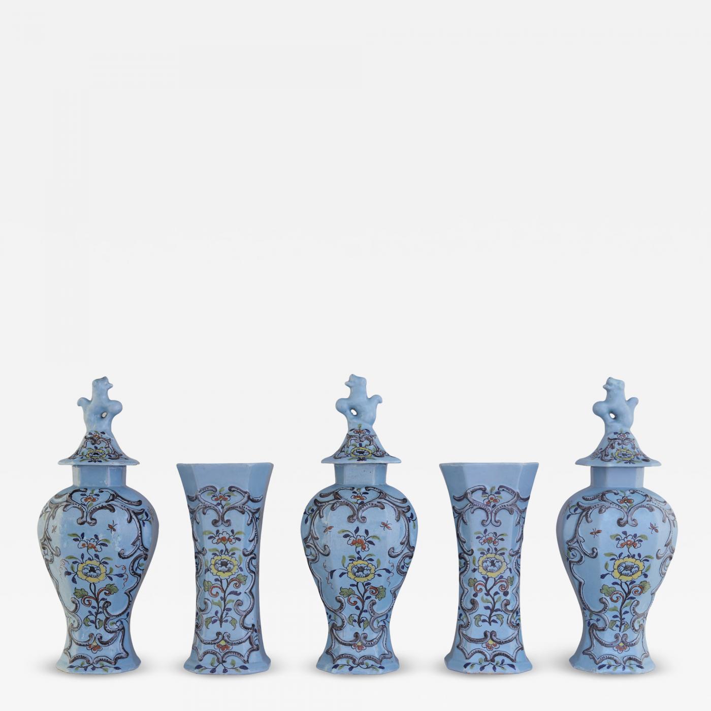 An extremely rare set of five Dutch Delft vases, a garniture, painted with a floral decoration on a turquoise ground. The color of these vases is highly unusual and rarely occurs on Dutch Delftware. We only know a hand full of other pieces in the color palet from museum collections, and no other garniture like this is known.
