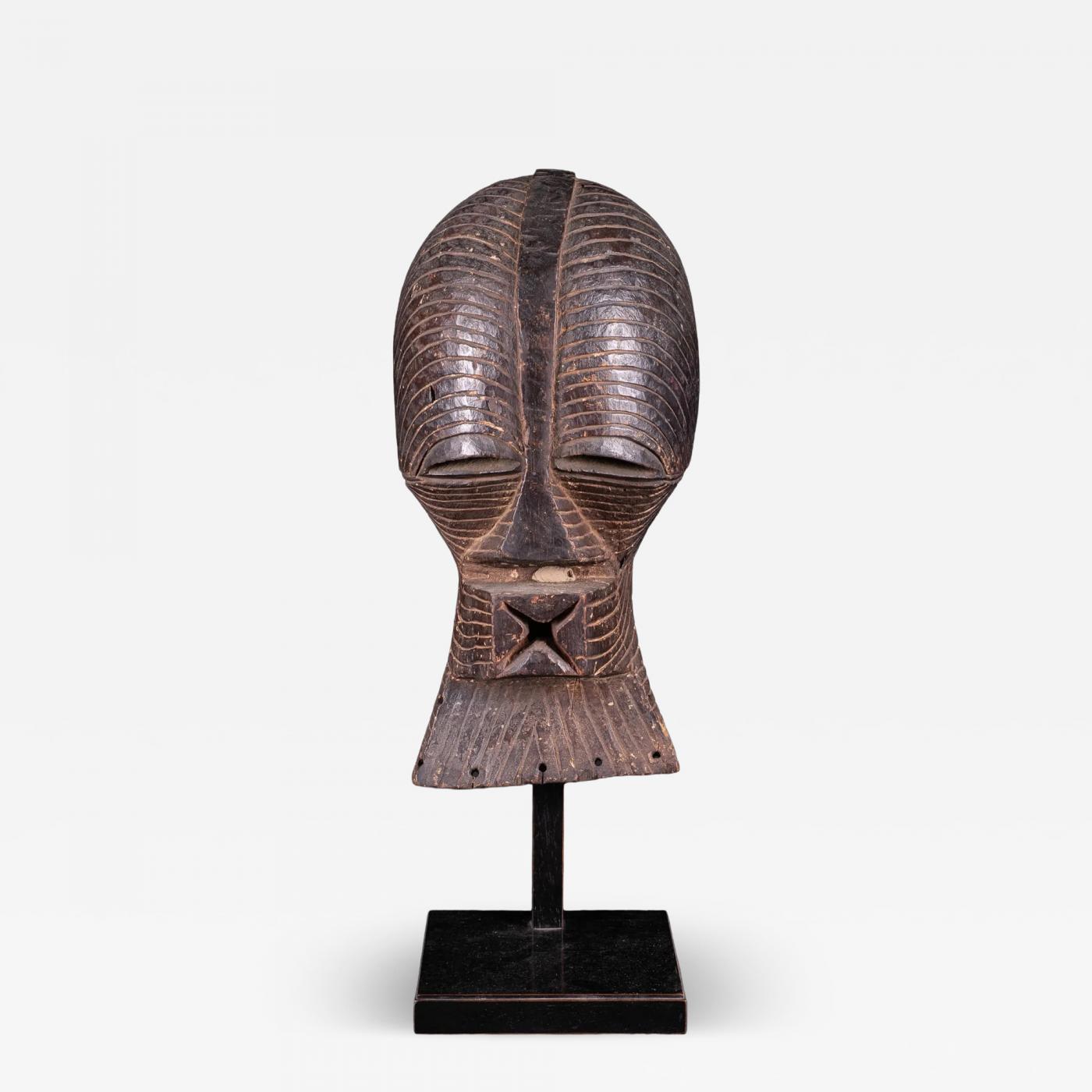 Traditionally, Kifwebe masks were created and worn by members of the secret masking society, Bwadi Bwa Kifwebe, of the Luba and the Songye People living in the central part of the Congo. They danced, representing spirits connecting this world with the spirit world. These masquerades were performed during rites associated with funerals and initiations, serving to rid the community of evil presences. Kifwebe masks represent abstracted male or female beings. Angular and thrusting forms characterize both types, and in both cases, the entire face is covered in patterns of geometric grooves that are uniquely characteristic of these masks. The face of typical Kifwebe masks is covered with linear incisions, a square protruding mouth and a linear nose set between globular pierced eyes. According to the specialists, Kifwebe masks are not only differentiated by their shape and size but also by the basic surface colouration and the decorative design and patterns on the surface. The masks said to represent a female are rarer than masks supposed to depict a male. Female masks, such as this one, will have no sagittal crest or perhaps a slightly raised flat one. They are directly related to the physical world and procreation; their task is to invoke benevolent spirits that will influence the future generation. They exude beauty, tranquillity and inner peace and are not aggressive in appearance. The female Kifwebe mask with a projecting mouth, triangular nose and almond-shaped eyes has an overall hourglass shape. It is completely covered with concentric linear carvings divided by a black vertical stripe running from the top of the head, over the nose, and up to the mouth. Contrary to most female Kifwebe masks, this one is dark brown. Patina with wear and age to the wood suggests this is a particularly early example, used for a long period of time. -
