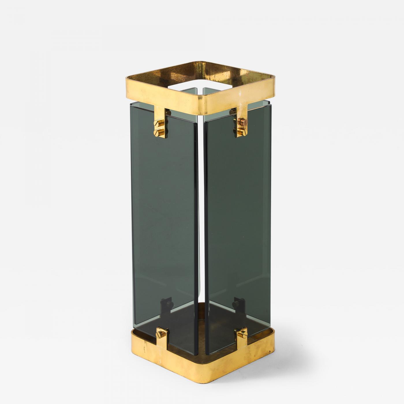 Max Ingrand for Fontana Arte modernist umbrella stand composed of four thick polished smoked glass plates suspended by polished brass frames and thick round screws, Italy, 1960s. This chic and exquisite midcentury umbrella stand is a fine example of the innovative design and impeccable craftsmanship of the artisan glass company Fontana Arte under the artistic direction of Max Ingrand.