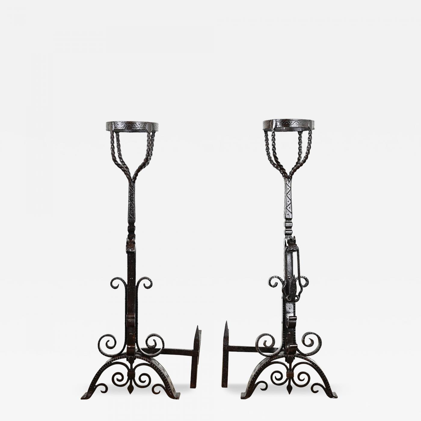 A towering pair of 18th century French forged, wrought iron andiron-chenets to watch over the hearth. They include a small basket at the top for warming, the rim impressed with a geometric pattern that is repeated on the column and contrasted by the twisted detail of the rods. Scrolled elements curl outward from the pillars attaching multiple spit hooks to adjust for cooking temperatures. Decorative scrollwork in between the arched legs are reminiscent of fleur-de-lis to underscore the French-made origins of these sculptural fireplace tools. Designed as a complementary pair, each andiron is the mirror image of the other with an offset hind leg (the bracket to elevate the burning logs) supported by a spike. Note that the stylized dragon heads remain intact but one of the rings is missing from the left. Please view the detailed images to see more. Sold as a pair. -