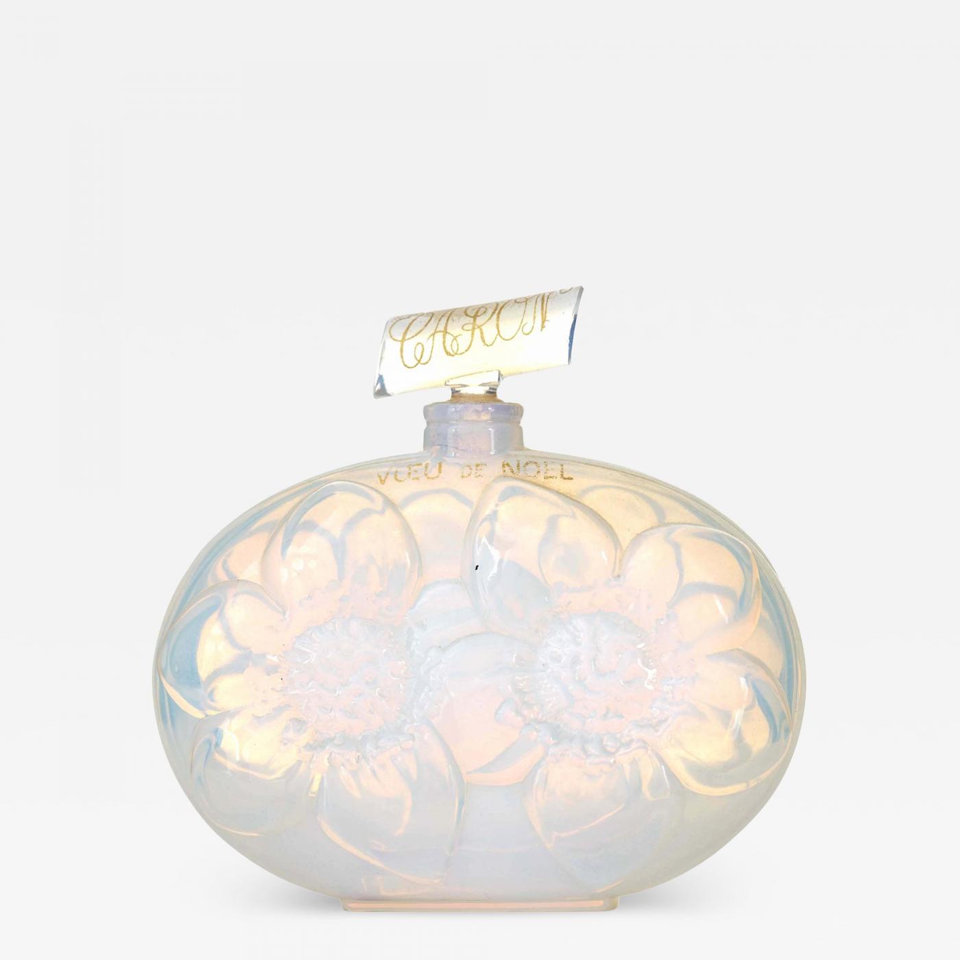 Depth: 1.5" || French Art Deco oval opalescent glass bottle with embossed flowers, perfume name "Vœu de Noël" written in gold, and a cylindrical stopper with brand name "CARON"