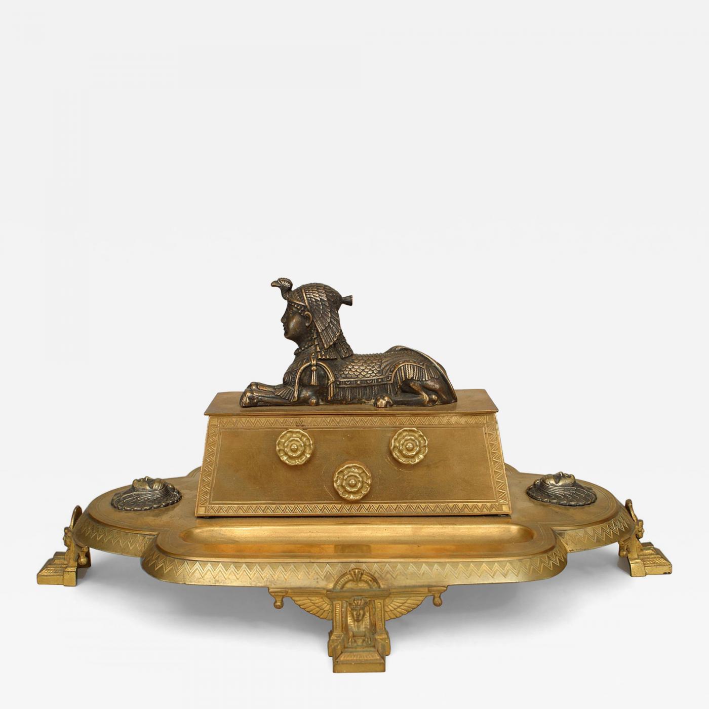French Empire-style (19th Century) bronze inkwell with silver Egyptian motifs and sphinx top.