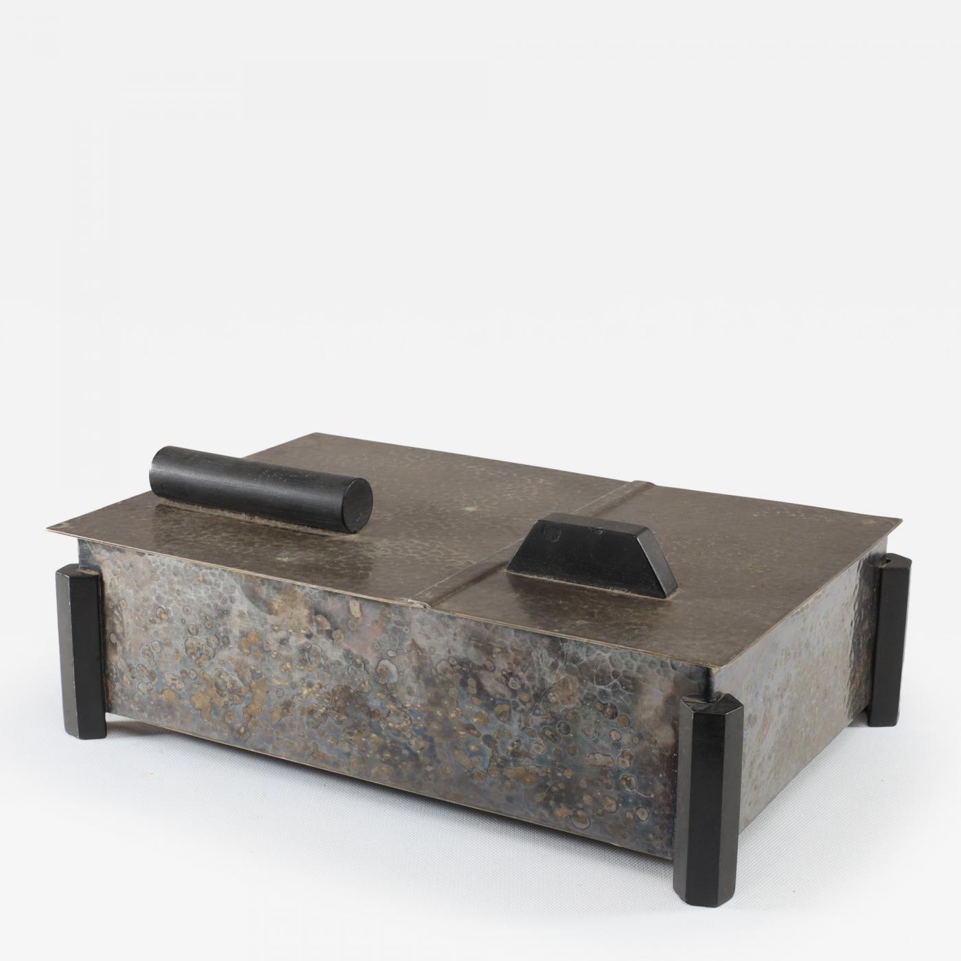 Depth: 5.91" || Georg Nilsson by Gero, Zeist. An Art Deco silver plated jewelry box with two compartments and two lids with ebonised Beech handles and four corresponding faceted upright legs that complete the design. Circa 1920's/30's.