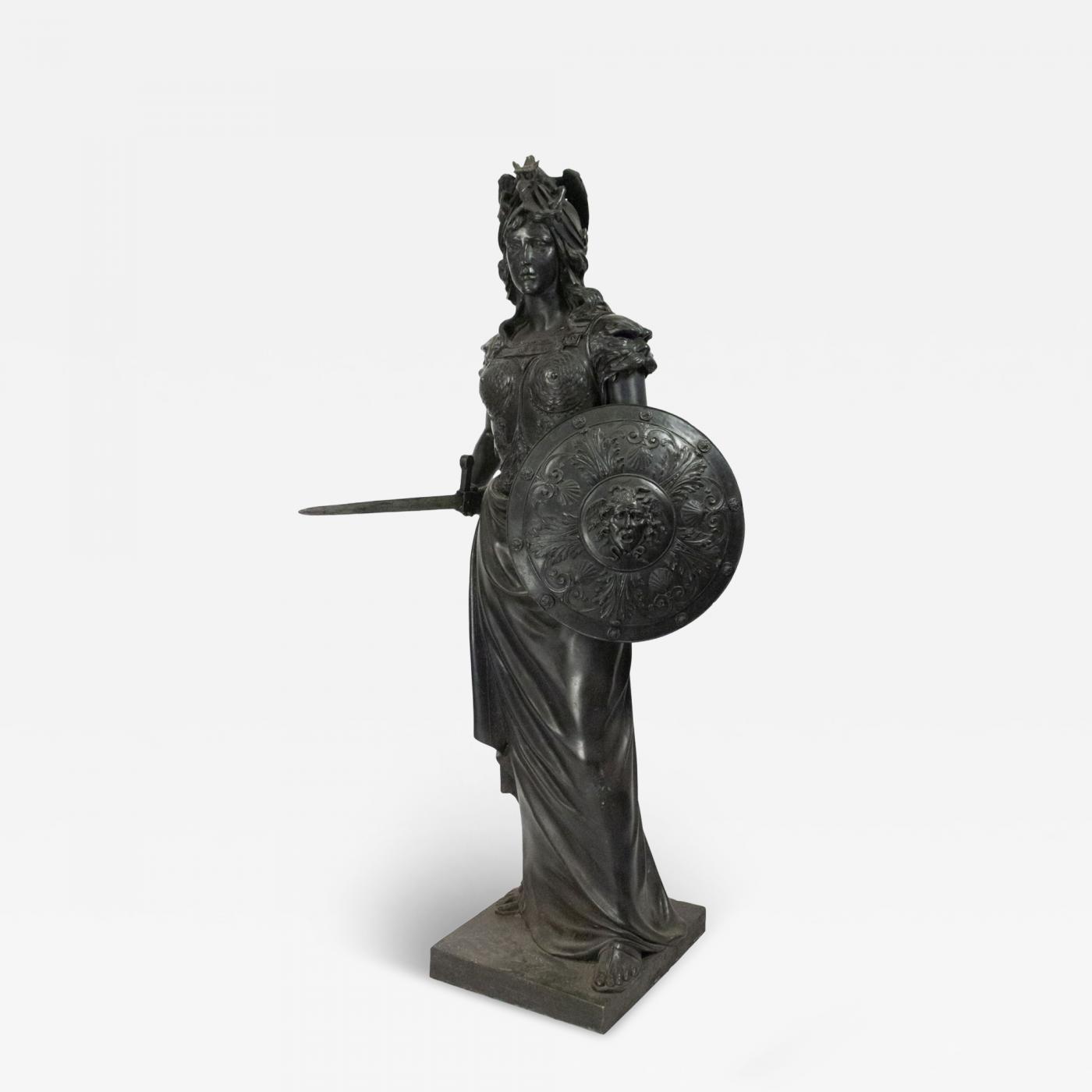 Grecian style bronze life size figure of classic woman (Athena) with military wardrobe holding a round decorated shield and a sword (sword replaced with wooden model) (19th Cent.)