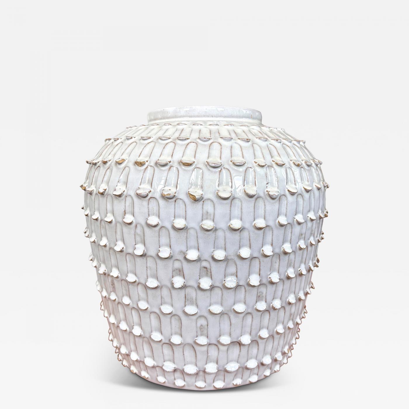 Large vase by Hegnetslund Lervarefabrik, having a wide, tapered form encircled in rows of carved strikes, glazed in glossy white; earthenware; Denmark, 20th century; impressed HLF mark