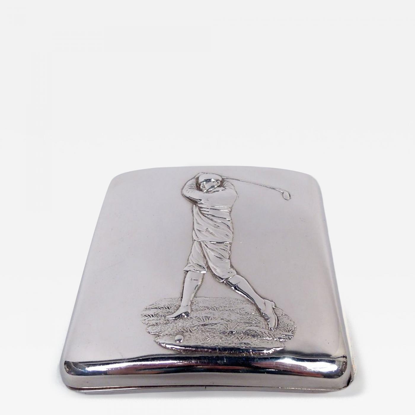 Victorian sterling silver golf-themed cigarette case. Made by Henry Matthews in Birmingham in 1900. Rectangular, concave, and right-hinged. On cover, a solo swinger with raised club and twisted body. Gilt interior. Push tab. A great gift for a left-handed smoker with an interest in golf. Fully marked. Very good condition.