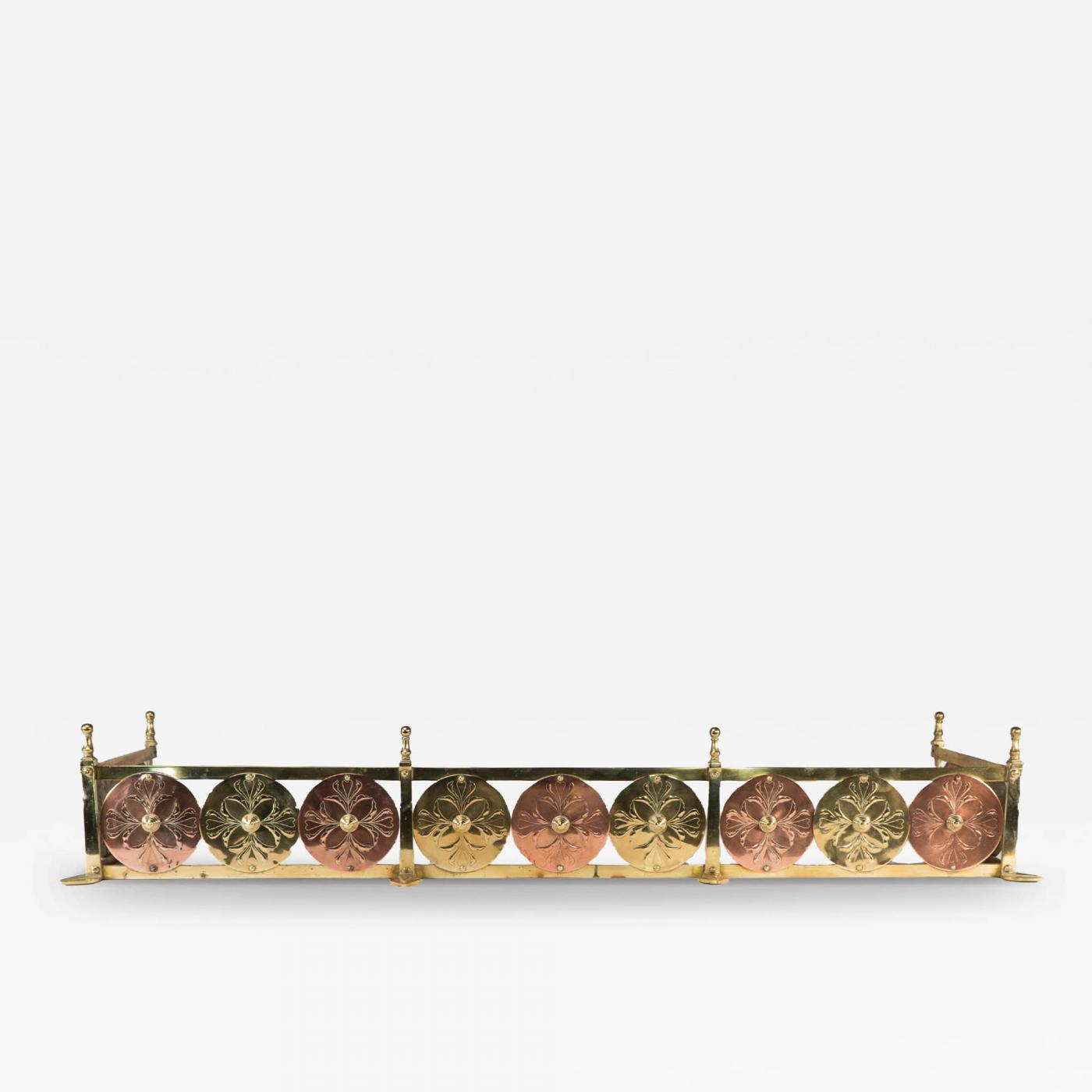 Depth: 12.01" || Creator: Heywood Sumner || William Arthur Smith Benson and Heywood Sumner. A rare and probably unique Arts & Crafts brass and copper fireplace fender surmounted with six finials and six leaf-shaped feet. The main body with alternating brass and copper discs, each with embossed floral decoration. The floral decoration to the discs is probably the design of Heywood Sumner who collaborated with Benson on some of his lighting designs particularly a three branch brass and copper wall candle sconce, also with embossed floral decoration.