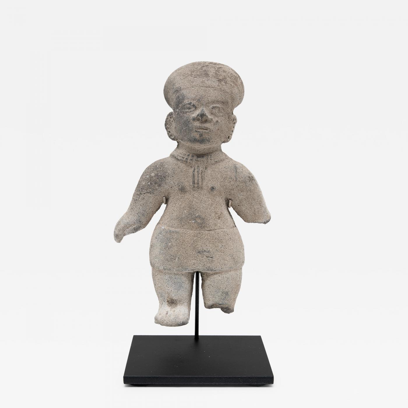 This standing effigy was crafted in 500-1000 AD Mesoamerica using the gray clay paste that characterizes La Tolita-Tumaco ceramics of early Colombia-Ecuador. The art of La Tolita-Tumaco civilization is considered one of the most developed of the pre-Columbian period as metalwork and ceramics were the most popular form of cultural expression. The ceramic creations of this culture were often based on the human figure to create portraits of people and realistic daily scenes of life cycles and the human condition. // Depth: 2.5"