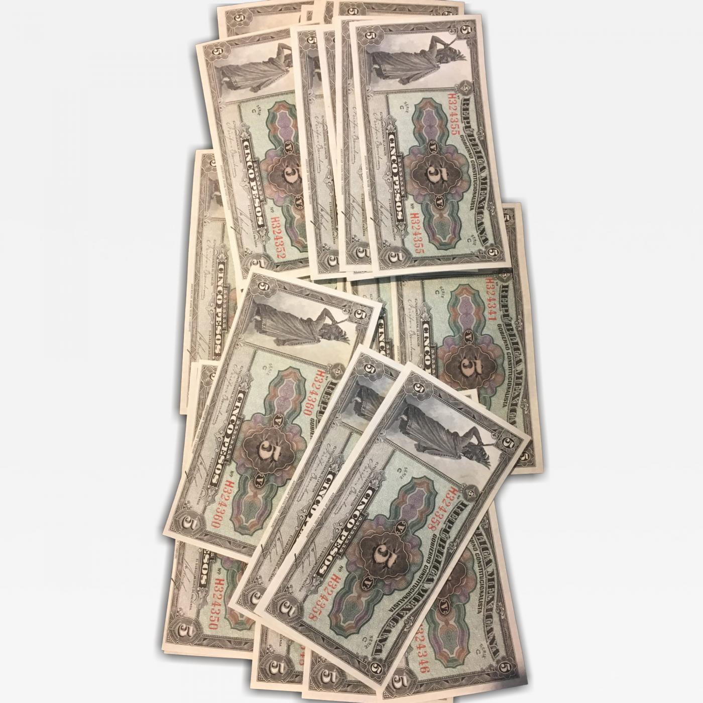 Lot of (27) 1921 Uncirculated Cinco Peso Notes Republica Mexicana