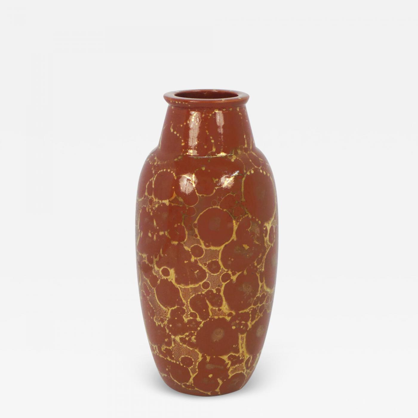 An Art Deco period hardstone vase having a brown glaze with gold décor. Made by Lucien Brisdoux (1878-1963). St. Amand, France, ca. 1925. Signed.