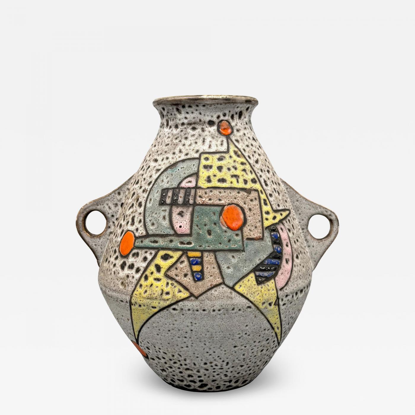 Large vase with handles in “fat lava” glazed ceramic, with abstract decoration in brightly colored enamels.