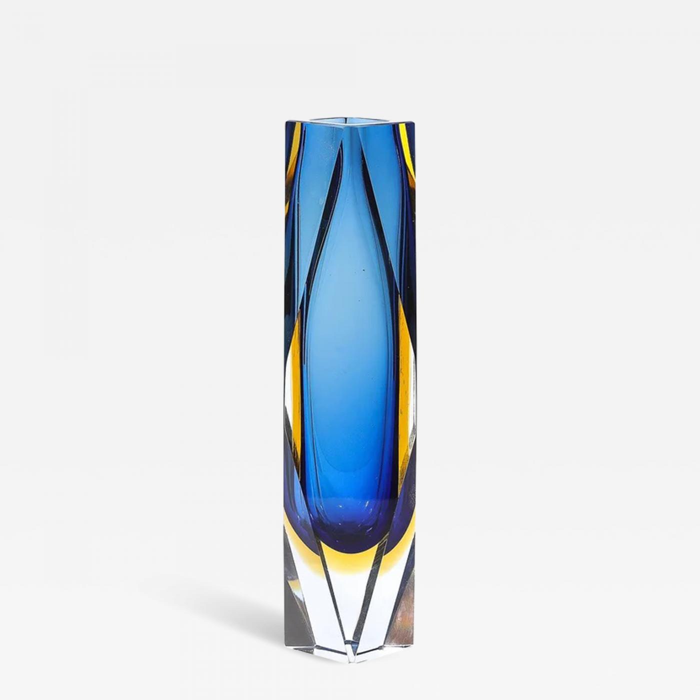 This Mid-Century Modernist Mandruzzato Sommerso Murano glass vase, created in Italy circa 1960, is a dazzling fusion of artistry and innovation. Hand-blown by Murano artisans, it showcases a dynamic color palette of citrine yellow and smoked cerulean blue, perfectly capturing the era’s bold aesthetic.