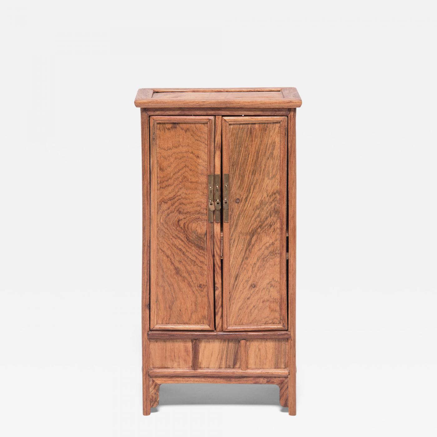 A full size cabinet with this level of workmanship would be an incredible find, but this beautiful piece of furniture—at only nine inches tall—is perfectly constructed down to the tiniest minutia. The petite cabinet was made in northern China out of huanghuali, a fine rosewood prized by furniture makers for its distinctive grain and incredible strength. The joinery techniques, hardware, and clean, modern lines all impeccably reflect the best Chinese furniture design. // Depth: 3.0"