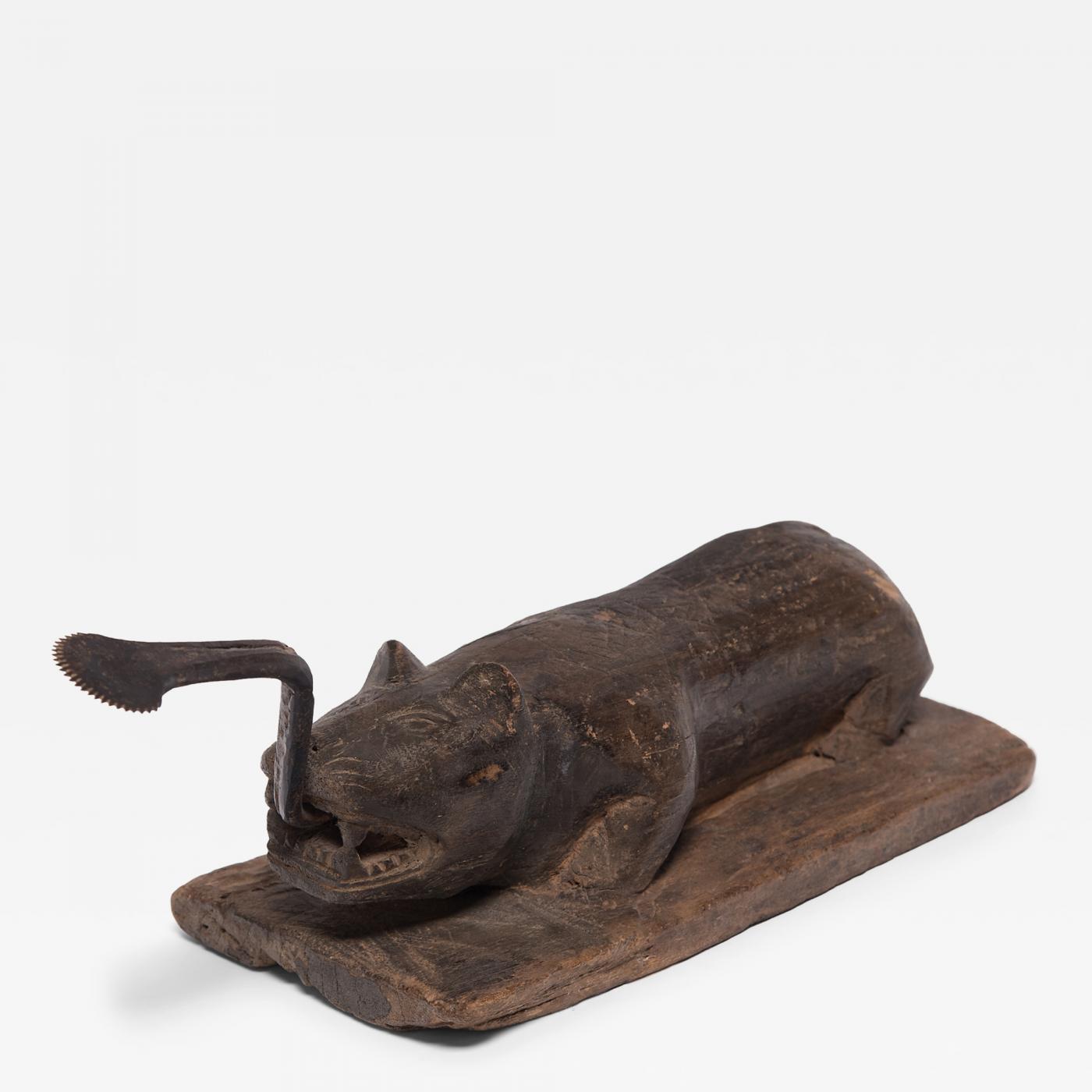 This sculptural early 20th century coconut splitter was carved into the form of a crouching beast ready to pounce. It was likely a merchant's tool in a South East Asian market used to split coconuts which were then ground into fine snow-like flakes for use in dumplings, sauces and sweetmeats. // Depth: 5.25"