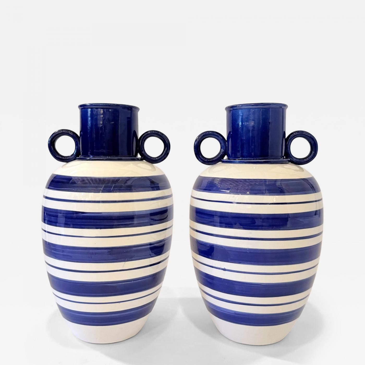 Pair of Italian handmade ceramic vases with bold, cobalt blue and white horizontal stripes and ring handles. Signed, M.C. on base.