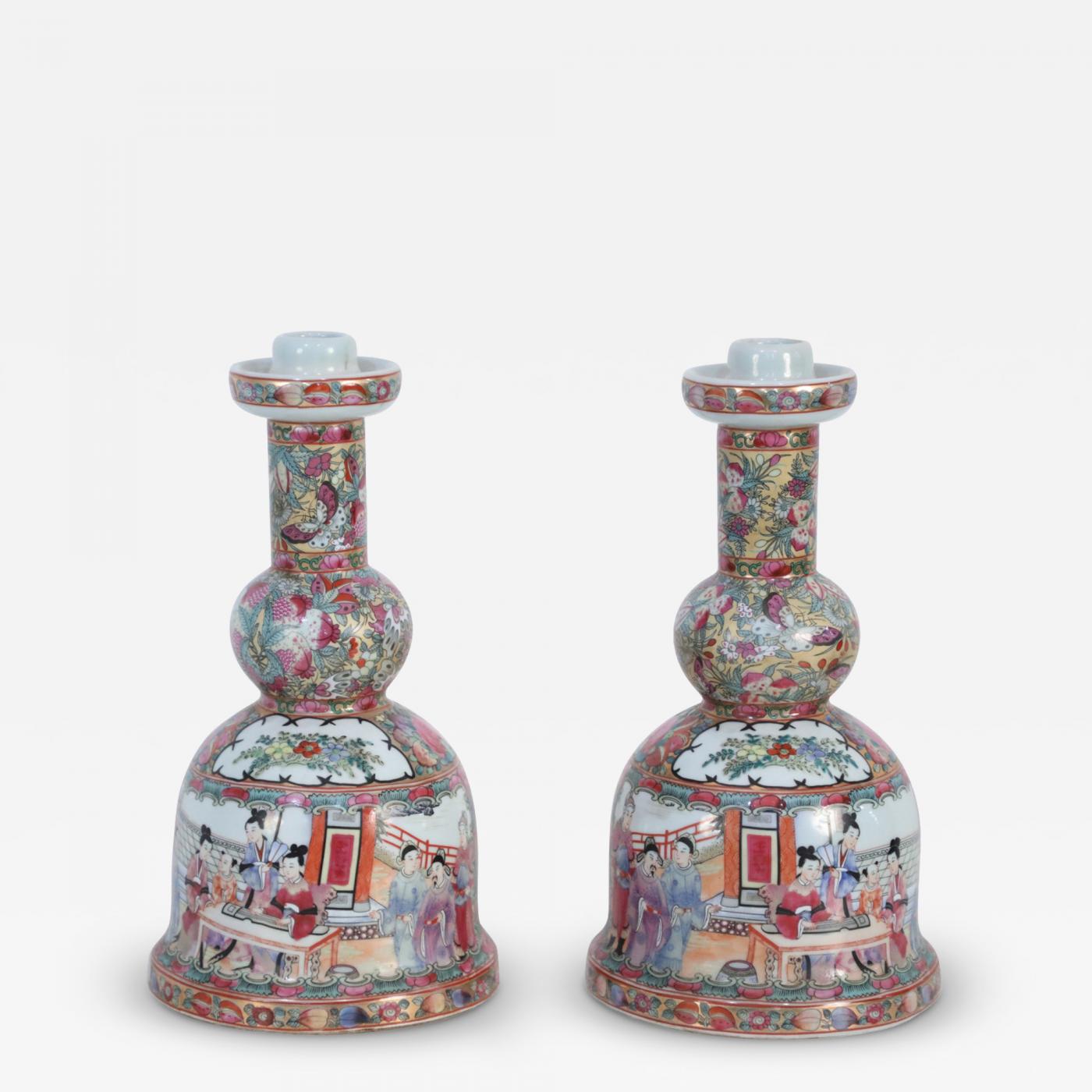 Pair of Chinese Rose Medallion and Genre Scene Candle Holders