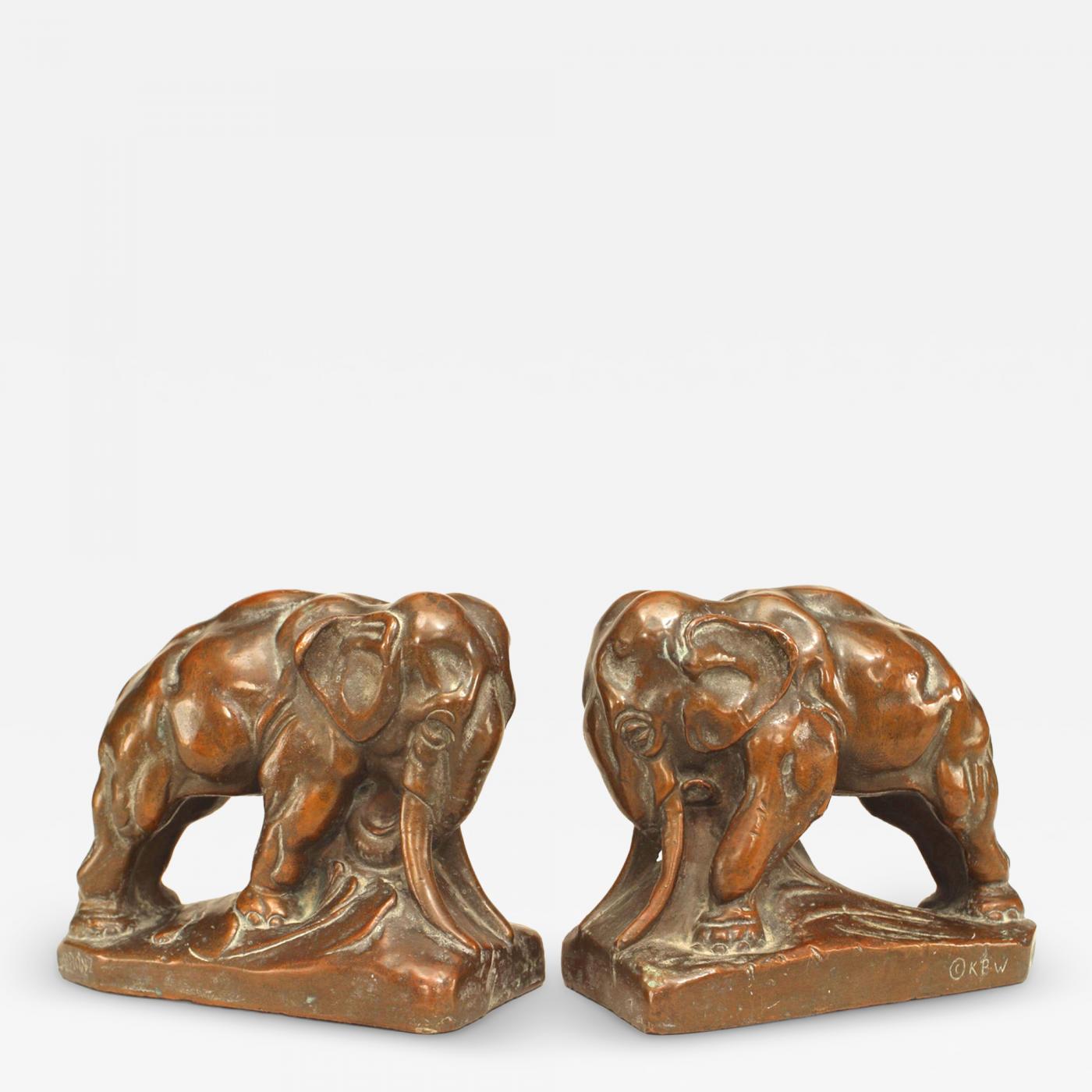 PAIR of Continental (possibly Austrian - 20th Century) bronze-patinated copper bookends in the form of elephants. (PRICED AS PAIR)