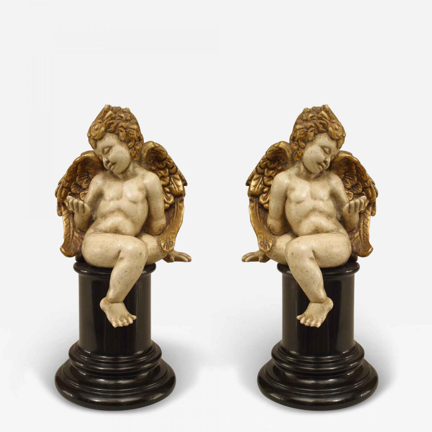 PAIR of Italian Rococo style (20th Cent) white painted composition cupid figures with gilt wings and mounted on black column bases