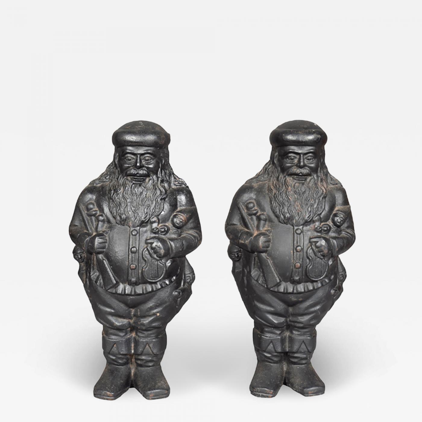 Pair Of St Nicholas Cast Iron Andirons cast as figures of a standing Santa holding toys.