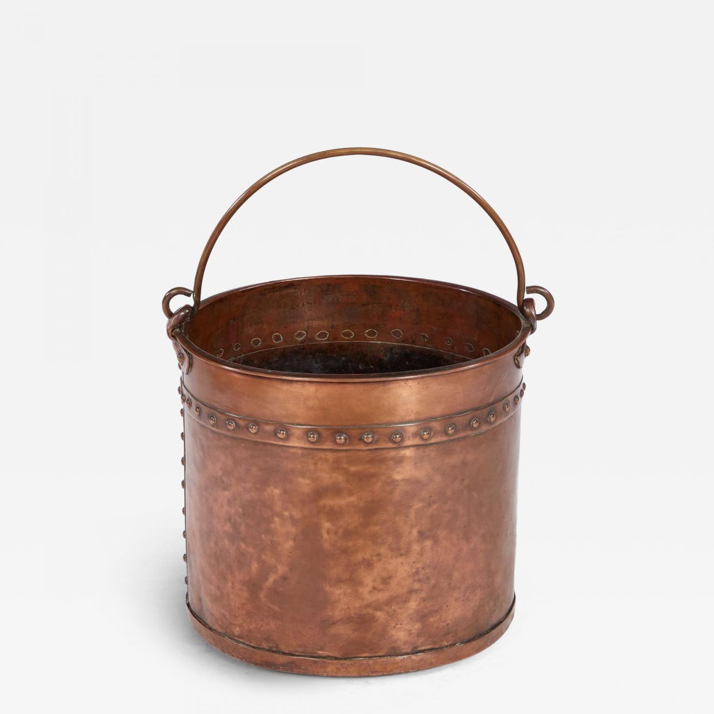 Mid-19th century English riveted copper apple kettle having "rat tail" brass bail carrying handle with hand forged mounts applied to hammered and hand riveted body, the whole with pleasing oxidation and color, ideal for kindling, wastepaper or planter.