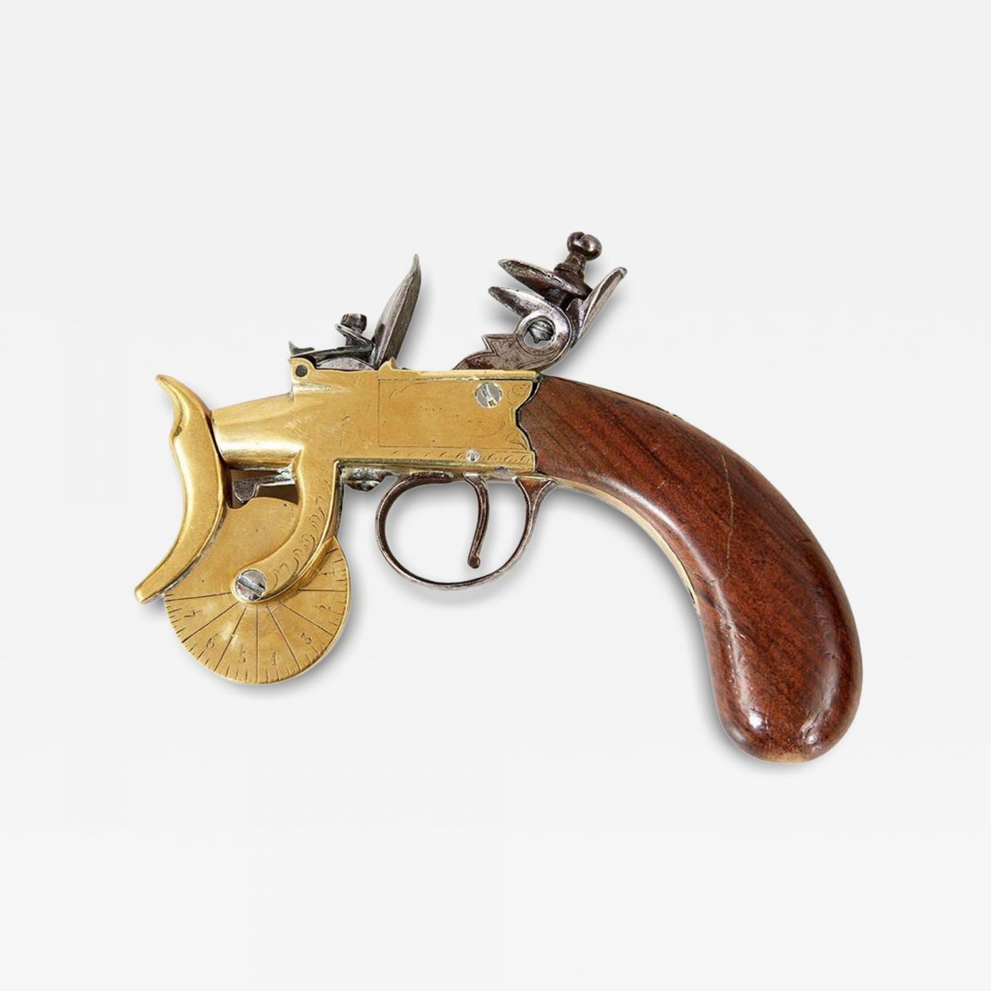 An rare 18th c. flintlock powder tester for the purpose of measuring the strength of gunpowder. Having a walnut handle with brass body and steel flintlock mechanism. With gauge makings to brass wheel and further etched decorative designs to brass and steel.