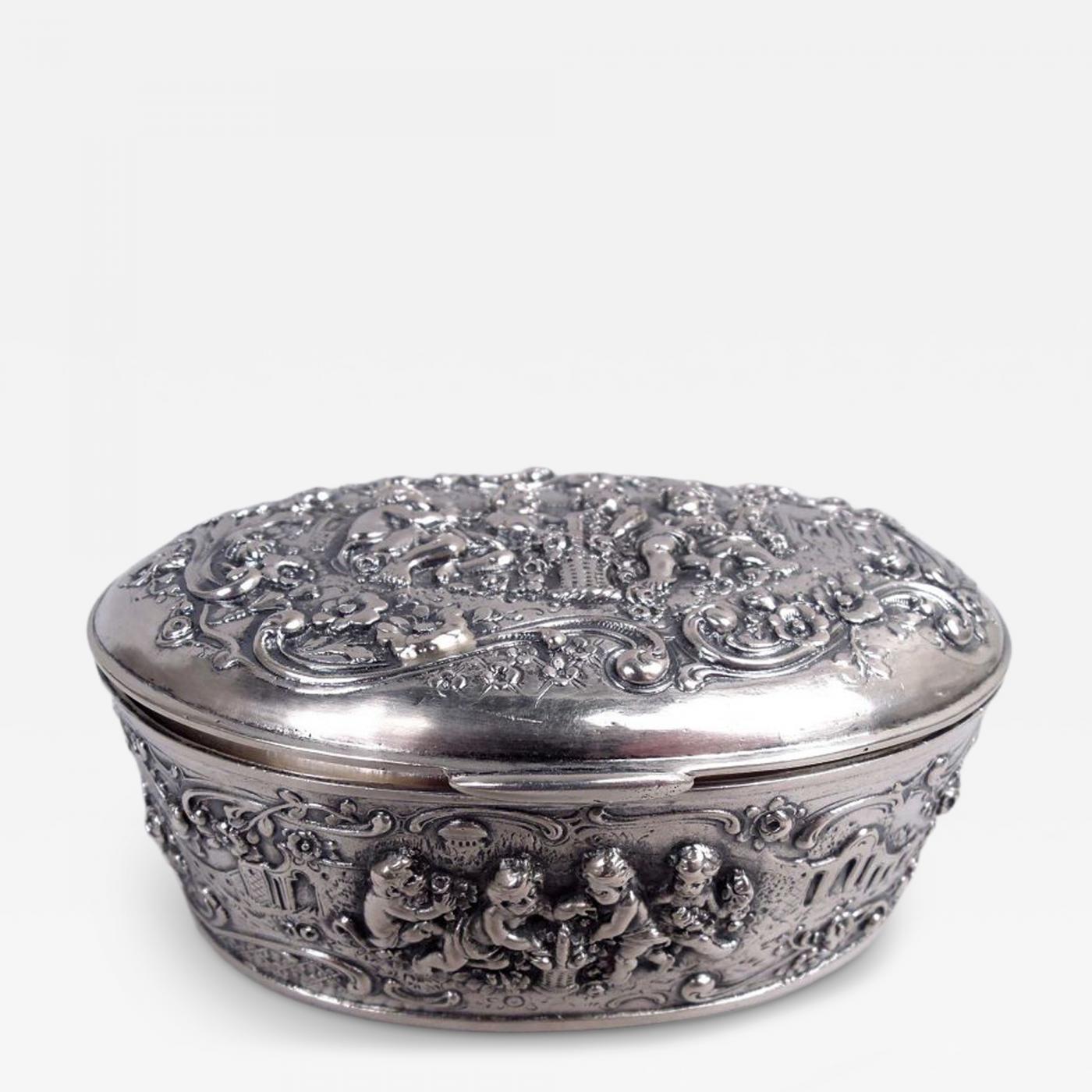 Pretty German Rococo silver keepsake box, ca 1910. Oval with hinged cover. Chased and engraved scrolled frames with groups of cherubs gathered around a basket; Classical architecture in background. Gilt interior. Marks include fineness stamp (800) and Yugoslav import stamp. Very good condition with deep patina.