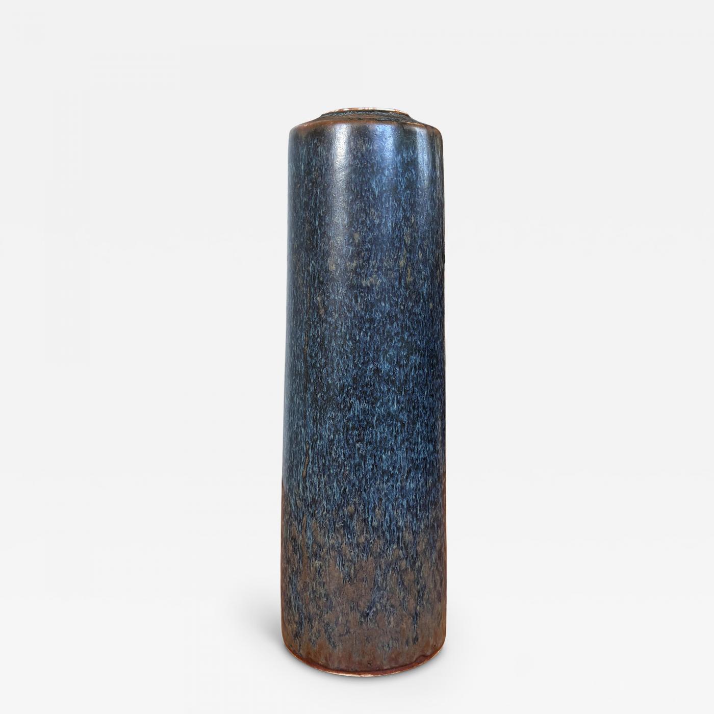 Nordic Modern vase by Carl-Harry Stålhane (1920-1990) for Rörstrand Fabriks, having a tall cylindrical form with flush mouth, glazed in black-dark gray and brown; stoneware; Sweden, 1960s; carved Rörstrand mark and artist initials