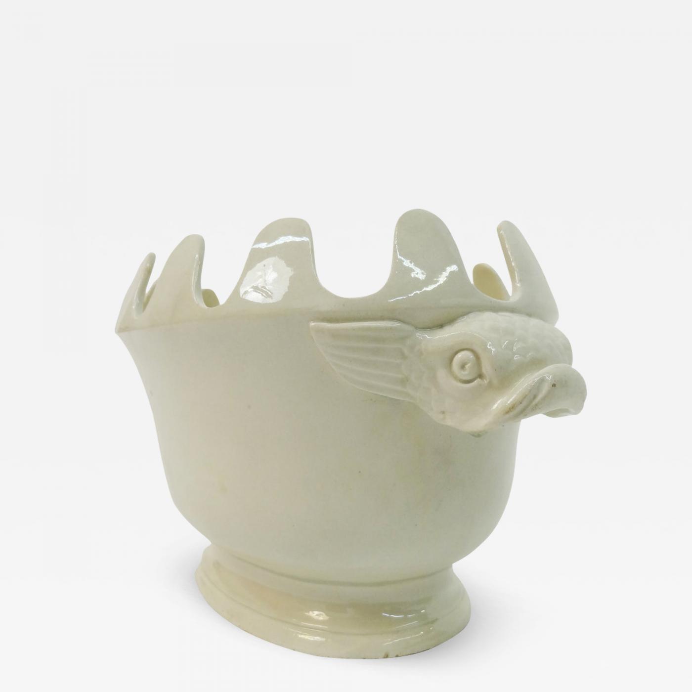 An exceptional Choisy-le-Roi white bone china montieth having rare dolphin form handles. France, Choisy-le-Roi factory. Blue under glaze star mark. France, circa 1830.