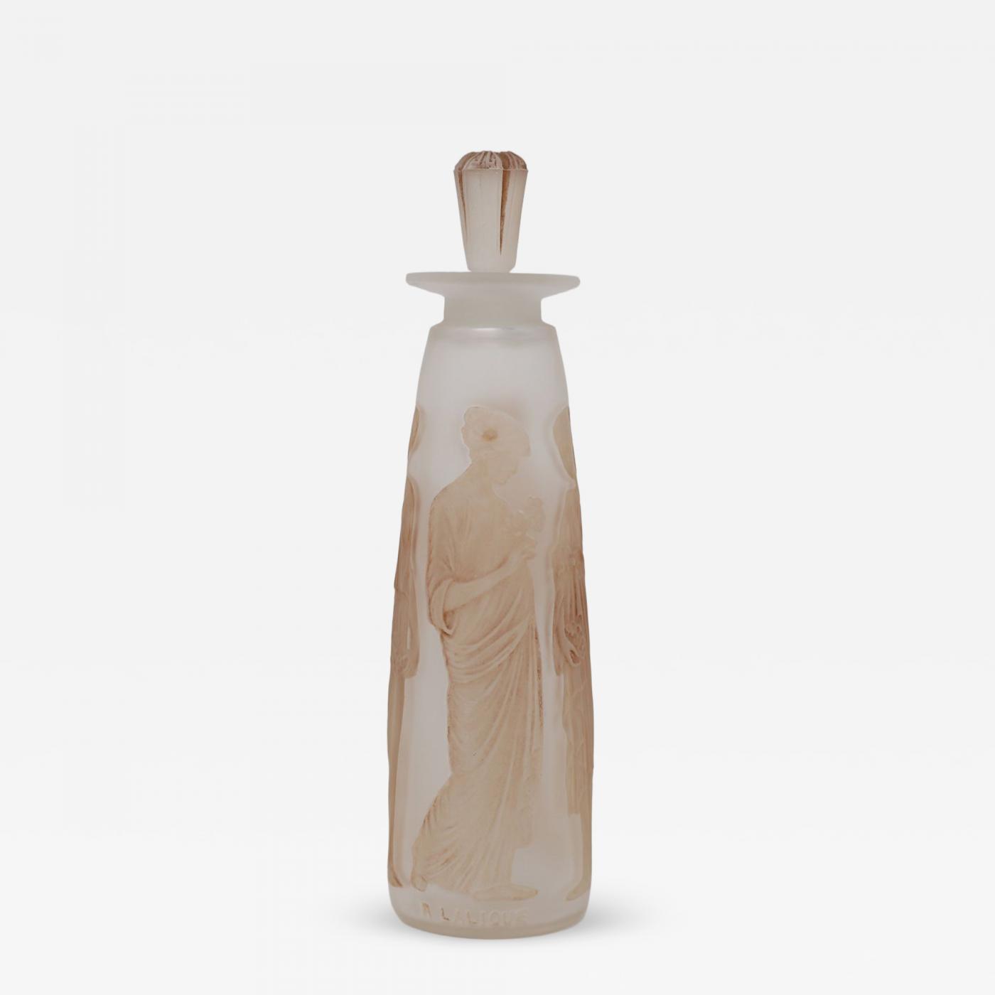 Rene Lalique clear & frosted, sepia stained glass perfume bottle. 'Ambre Antique' design. This design features robed maidens, holding flower bouquets. Moulded makers mark, 'R LALIQUE'. Book reference: 'R. LALIQUE Catalogue Raisonne De L'Oeuvre De Verre', by Felix Marcilhac. Les Editions De L'Amateur. Figure Coty 3.