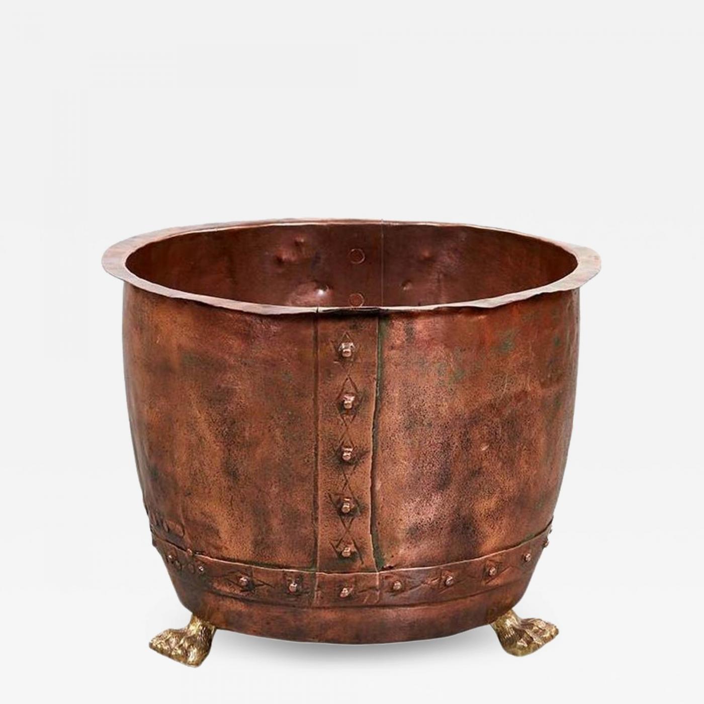 A copper bin having riveted seams and curved sides, standing on paw feet. Useful for logs or kindling next to a fireplace.