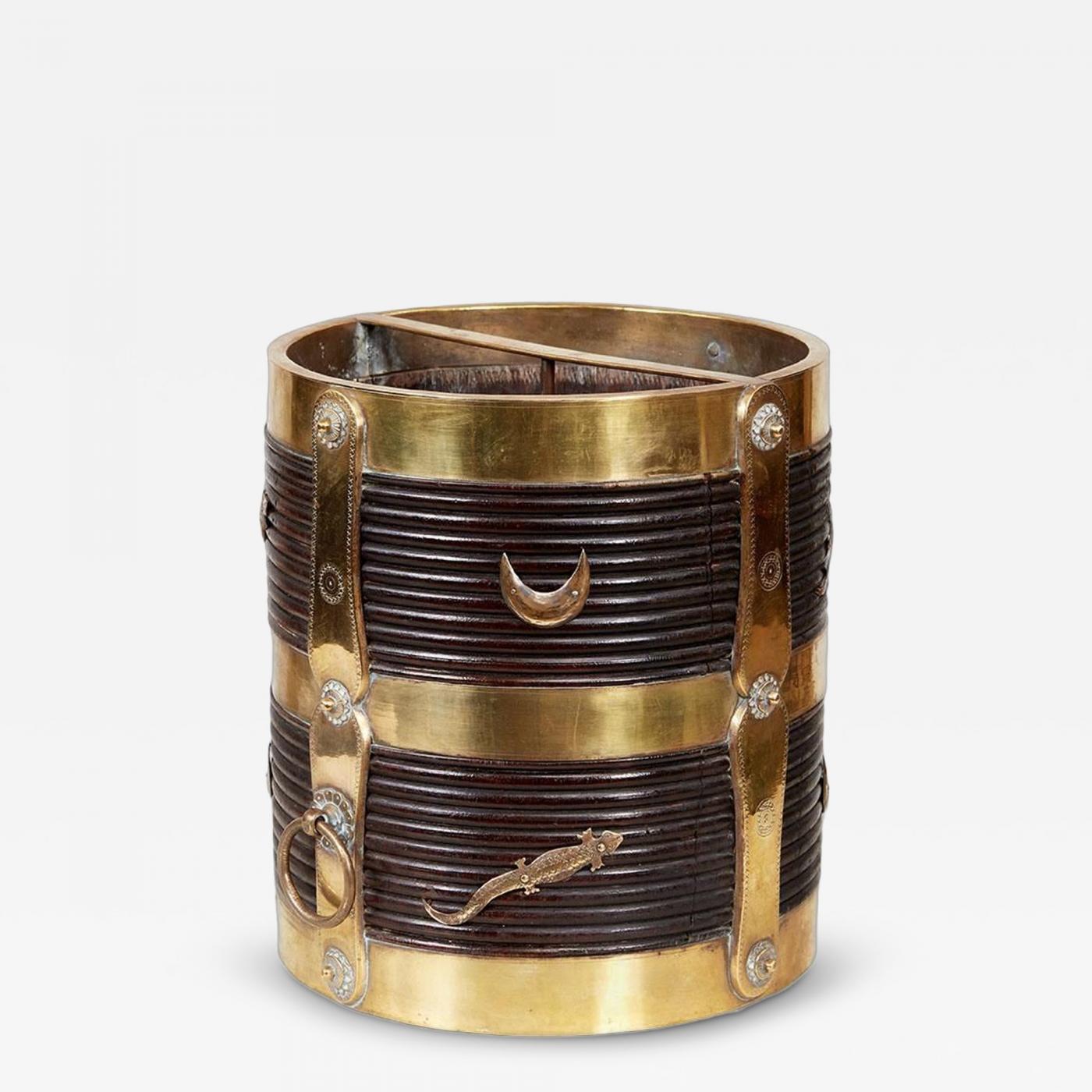 A fine Anglo Indian rosewood bucket with turned ribbing, brass bands and vertical shaped and chiselled brass straps with elaborate rivet heads and carrying rings, also decorated with salamanders and crescent moons, ancient symbols of serenity and resilience.