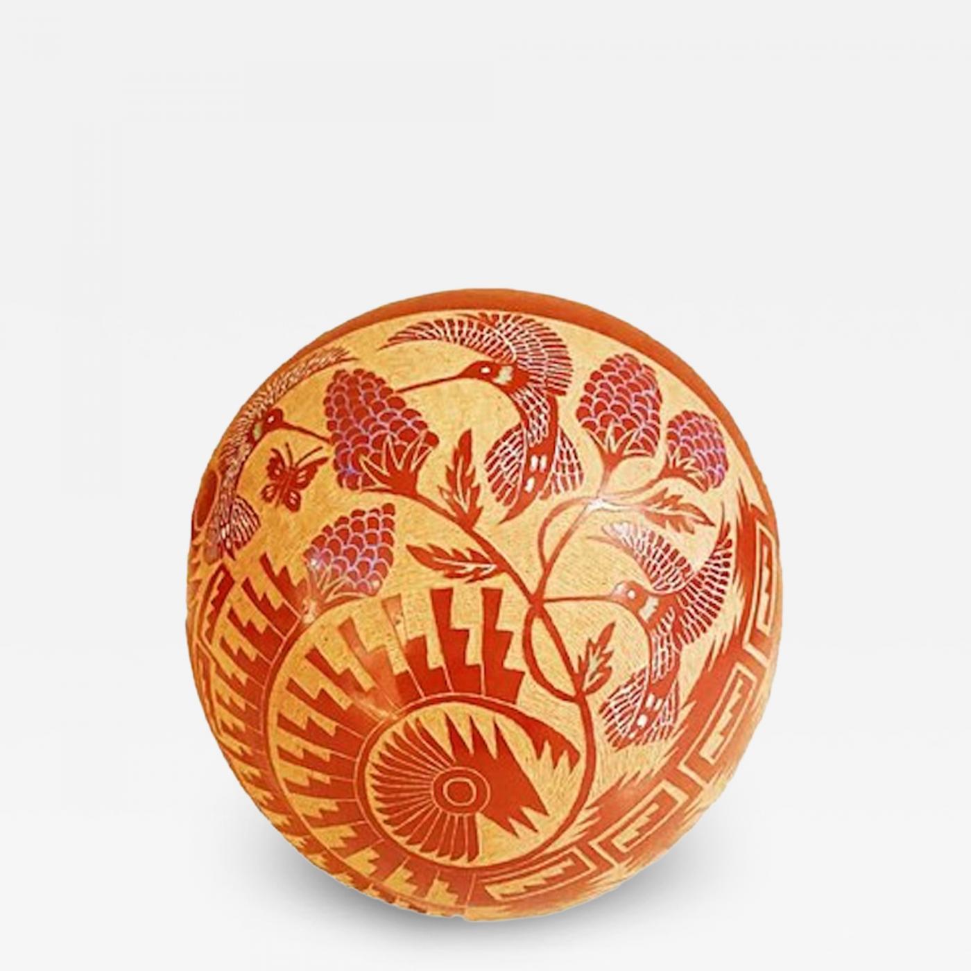 This small seed jar by Grace Medicine Flower is a fine example of sgraffito work. Grace Medicine Flower is one of the contemporary artists who excels at this technique. The jar is coiled, slipped and polished in the traditional manner. The design is then developed by “scraping away” layers of the slip. It is very difficult to do this technique, as the artist has to be careful not to cut too deeply into the coil or the pot will be ruined. Firing is done in the traditional manner, over an open fire. -